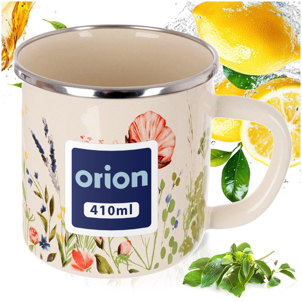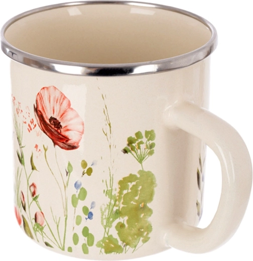 Stijlvolle geëmailleerde mok met een inhoud van 400 ml in crèmekleur met een decor van veldbloemen. Dankzij de stevige constructie en de roestvrijstalen rand is hij geschikt voor dagelijks gebruik, zowel thuis als buiten. Veilig materiaal, praktisch oor, verwarmen op fornuis en in oven mogelijk en eenvoudig te reinigen in de vaatwasser maken deze mok een uitstekende keuze voor thee, koffie en cacao.