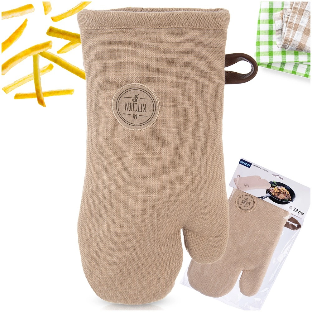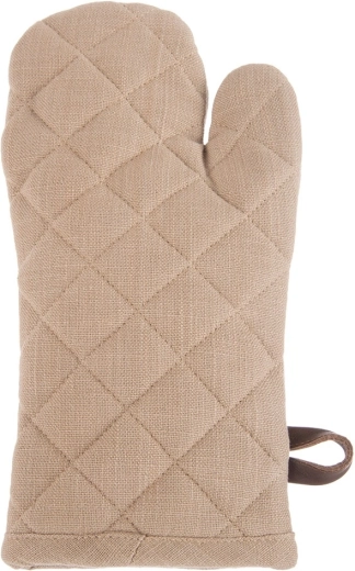 Deze bruine katoenen ovenwant (17,5 × 32 cm) is ontworpen voor veilig hanteren van hete bakplaten en kookgerei. De universele pasvorm zit goed aan beide handen en de zachte vulling zorgt voor een zekere grip en comfort.