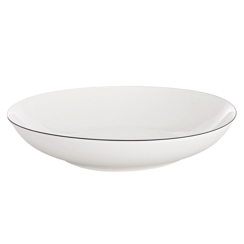 Elegant diep bord van hoogwaardig porselein in het wit met een dunne donkere rand. Ideaal voor soepen, pasta en salades, met een inhoud van 600 ml en een diameter van 20 cm. Geschikt voor de vaatwasser en de magnetron, perfect voor dagelijks gebruik en feestelijke gelegenheden.