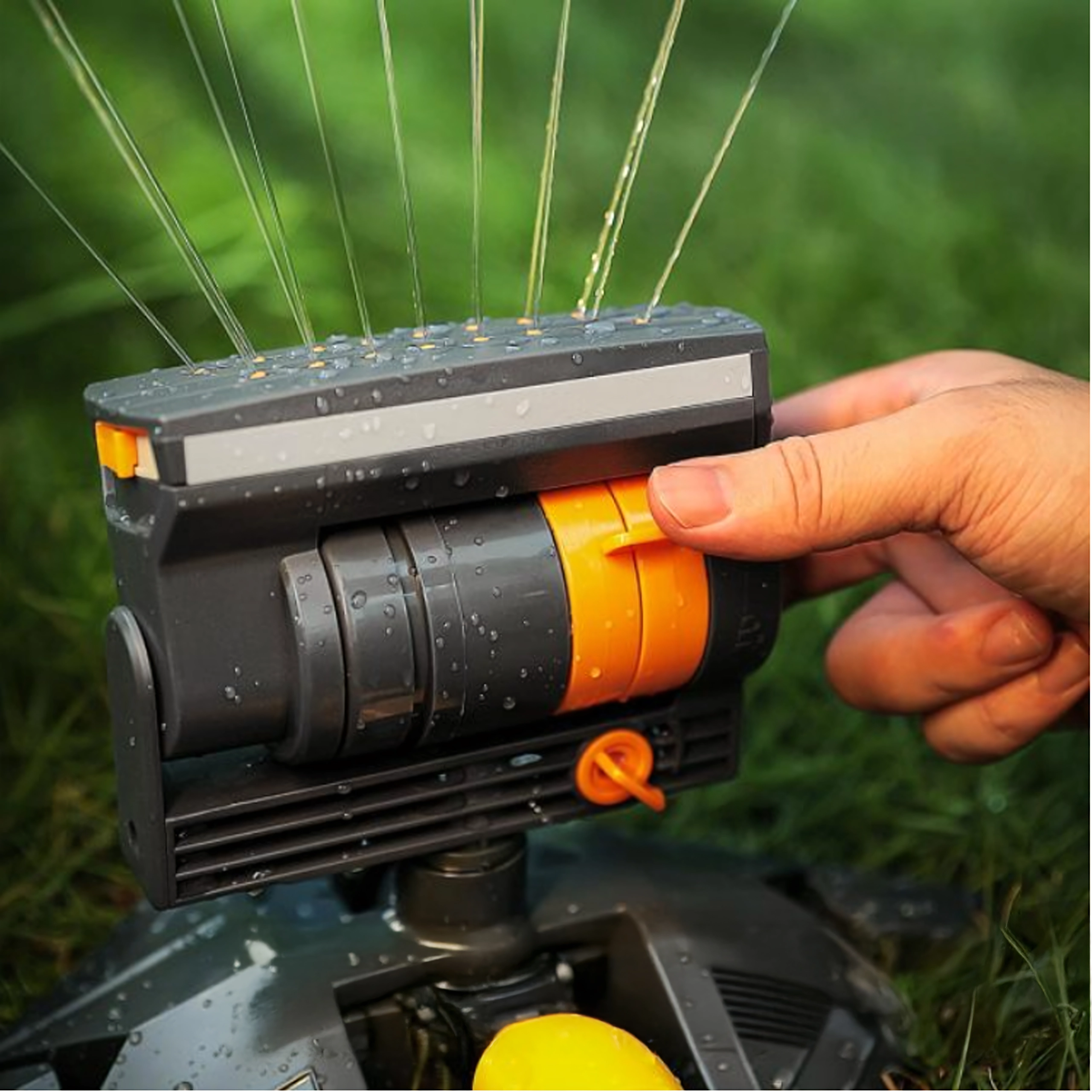 Met de bedienelementen pas je eenvoudig de breedte, richting en reikwijdte van de sproeistraal aan voor nauwkeurige dekking volgens de vorm en grootte van de tuin.