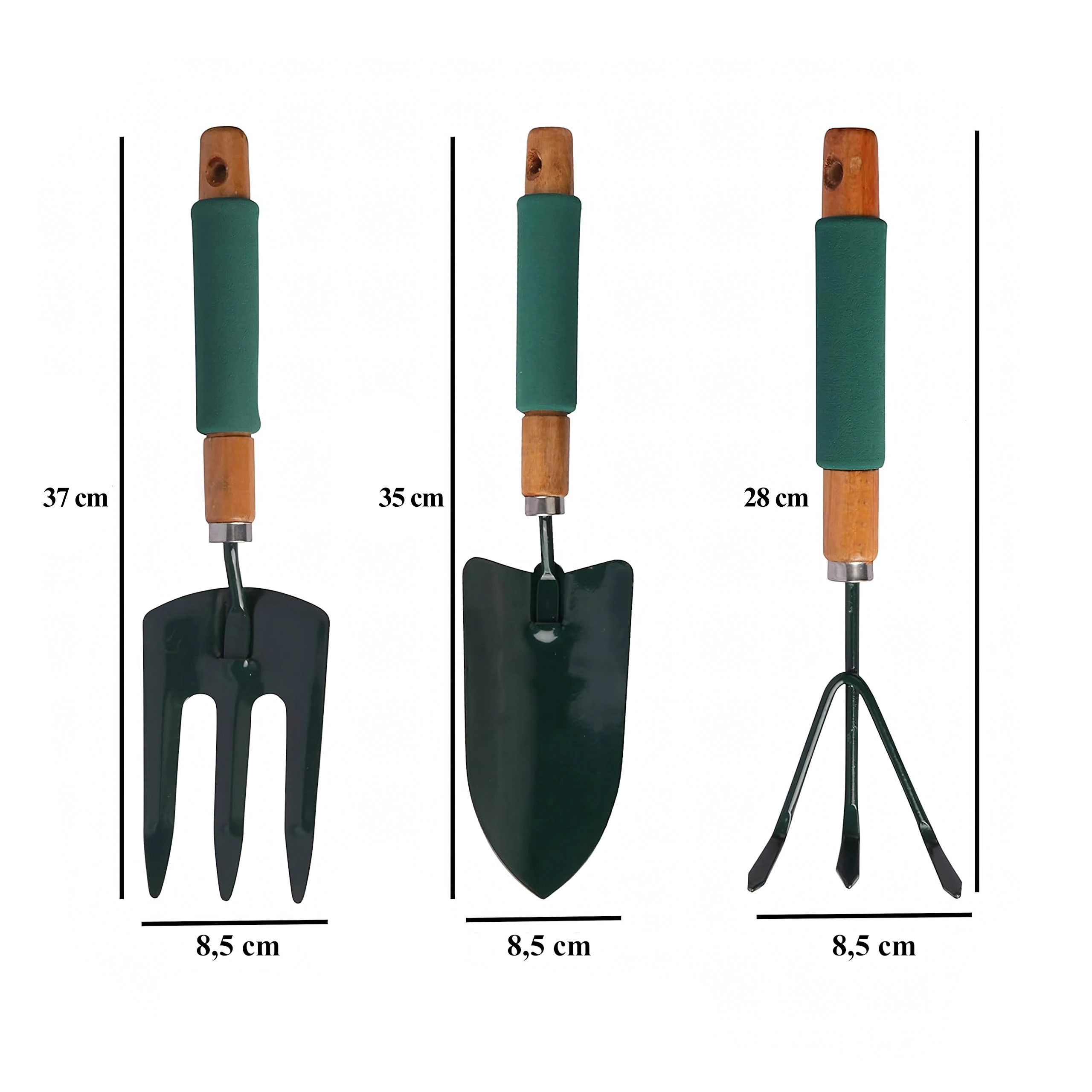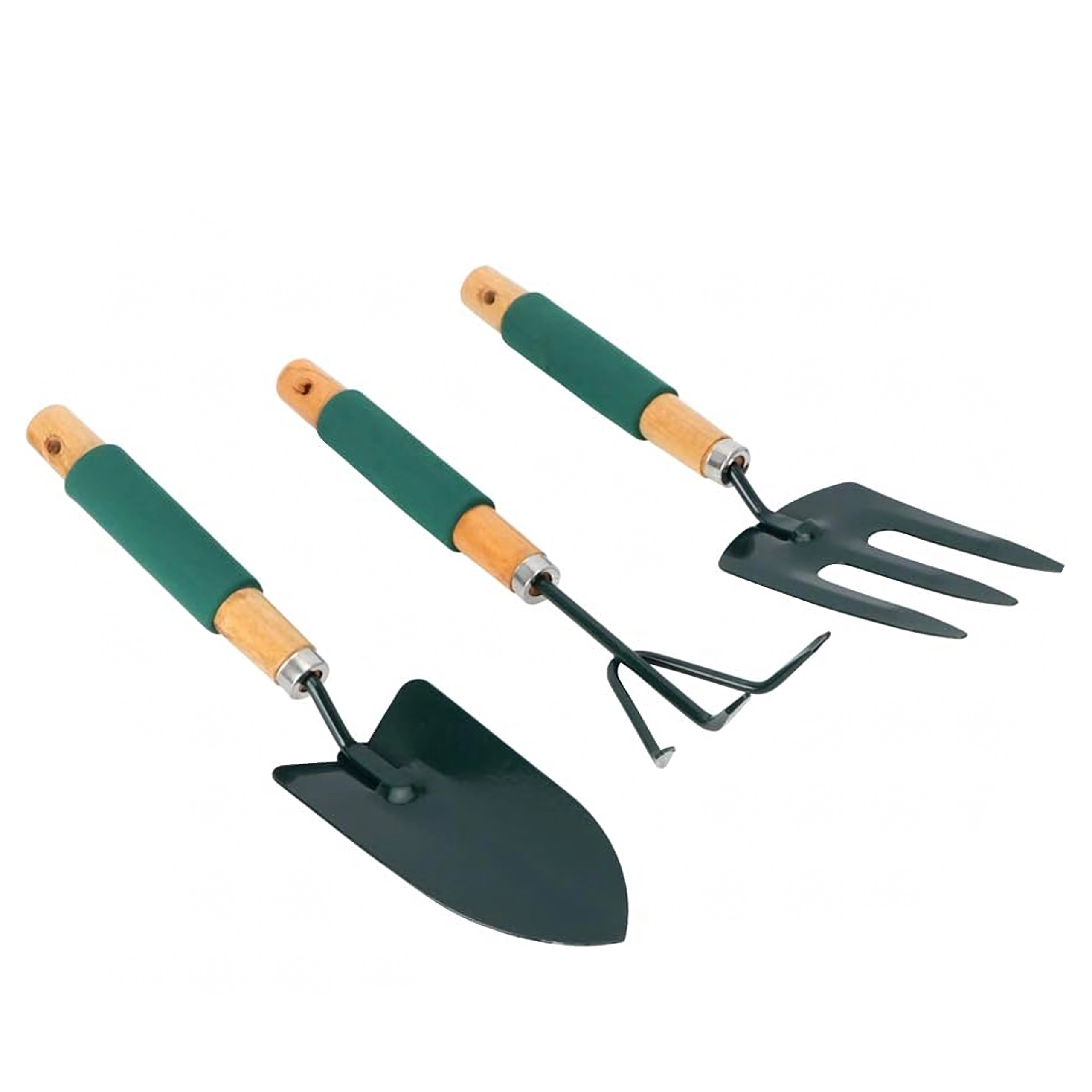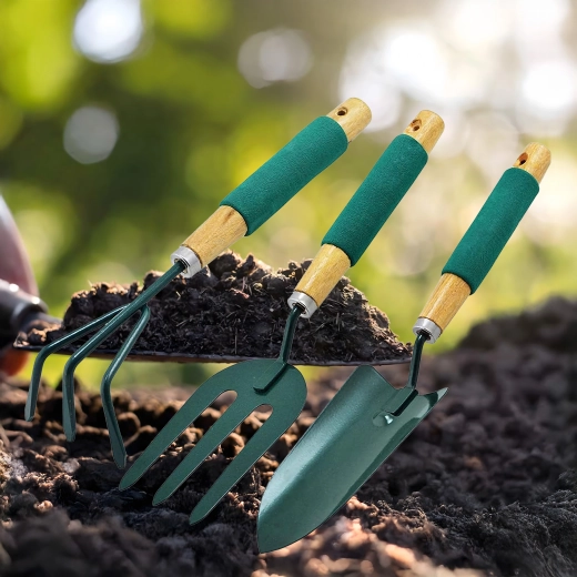 Praktische set van drie handgereedschappen voor het verzorgen van borders en bloempotten – schep, cultivator/mini-hark en tuinvork. Duurzame metalen werkdelen en ergonomische, antisliphandgrepen zorgen voor comfortabel werken bij het spitten, losmaken van de grond en verplanten.