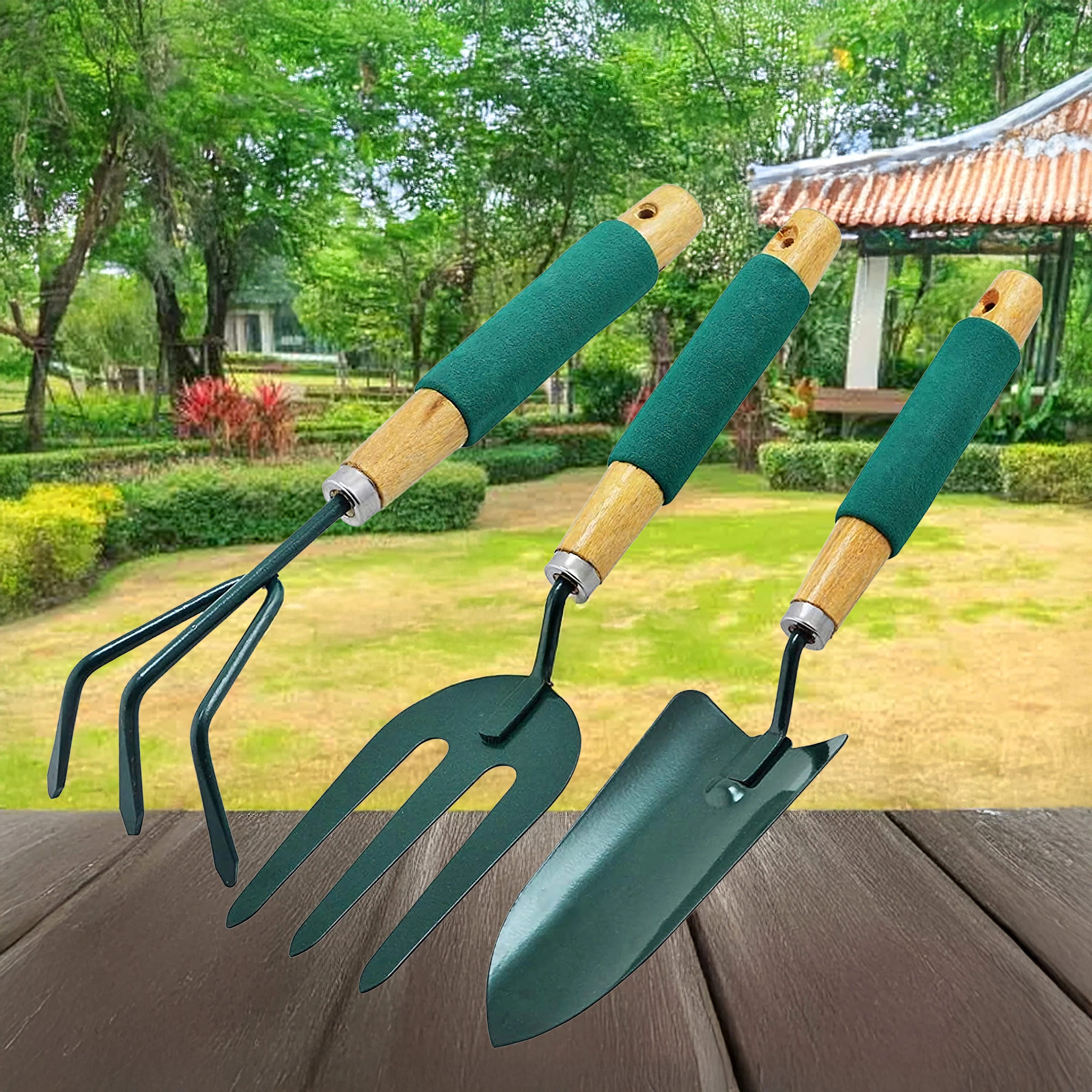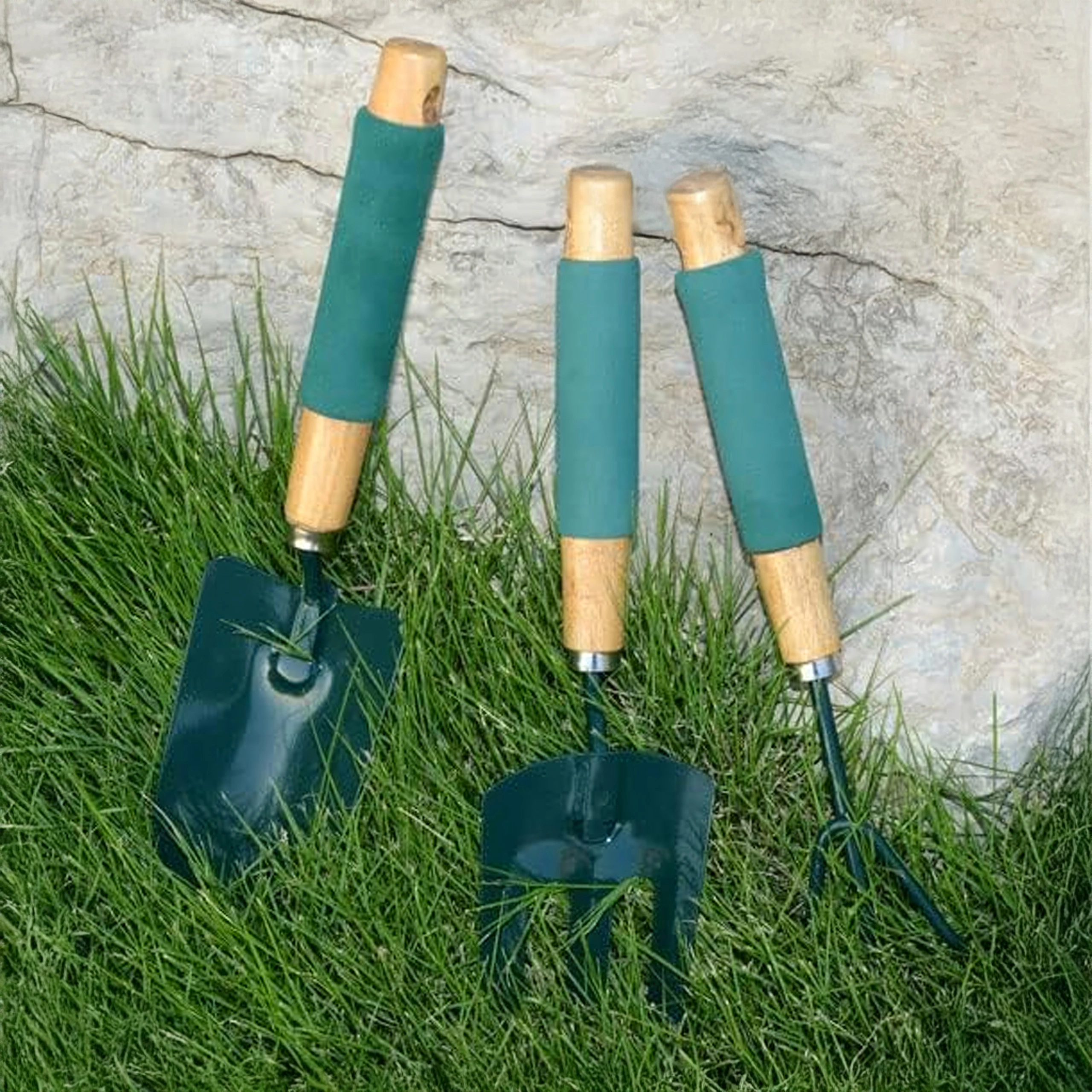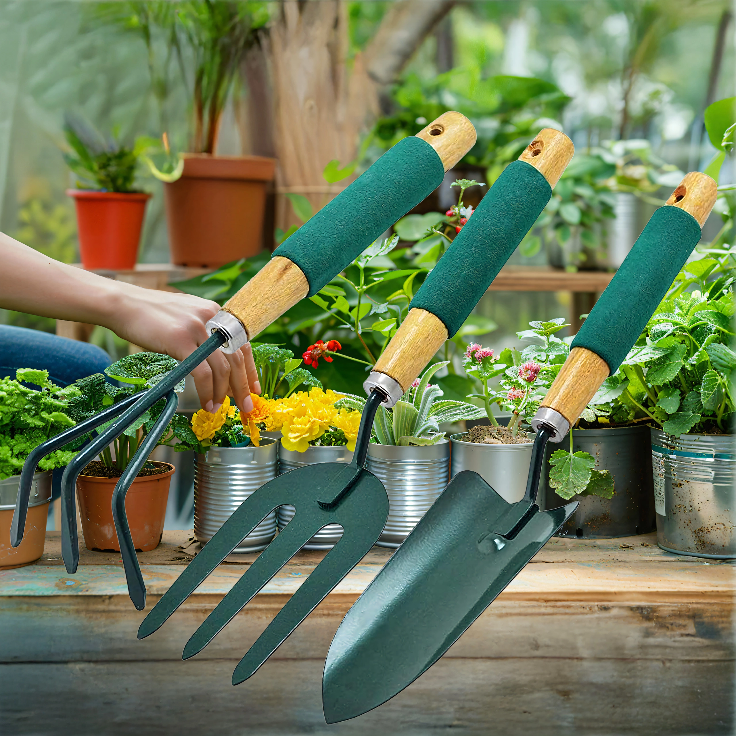 Praktische set van drie handgereedschappen voor het verzorgen van borders en bloempotten – schep, cultivator/mini-hark en tuinvork. Duurzame metalen werkdelen en ergonomische, antisliphandgrepen zorgen voor comfortabel werken bij het spitten, losmaken van de grond en verplanten.