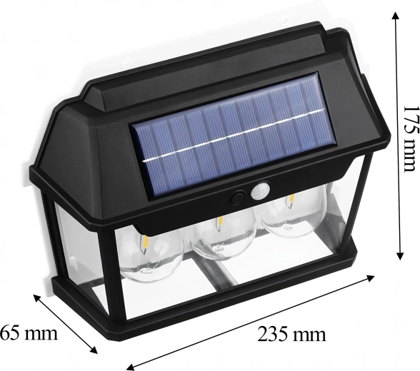 De stijlvolle buitenlantaarn combineert moderne zonnetechnologie met de decoratieve uitstraling van drie LED “gloeilampen”. Dankzij de geïntegreerde PIR-sensor reageert hij op beweging en geeft hij extra licht precies wanneer je het nodig hebt – voor een veiligere entree, verlichting van het pad of het terras. De installatie is snel en zonder elektrische bedrading.