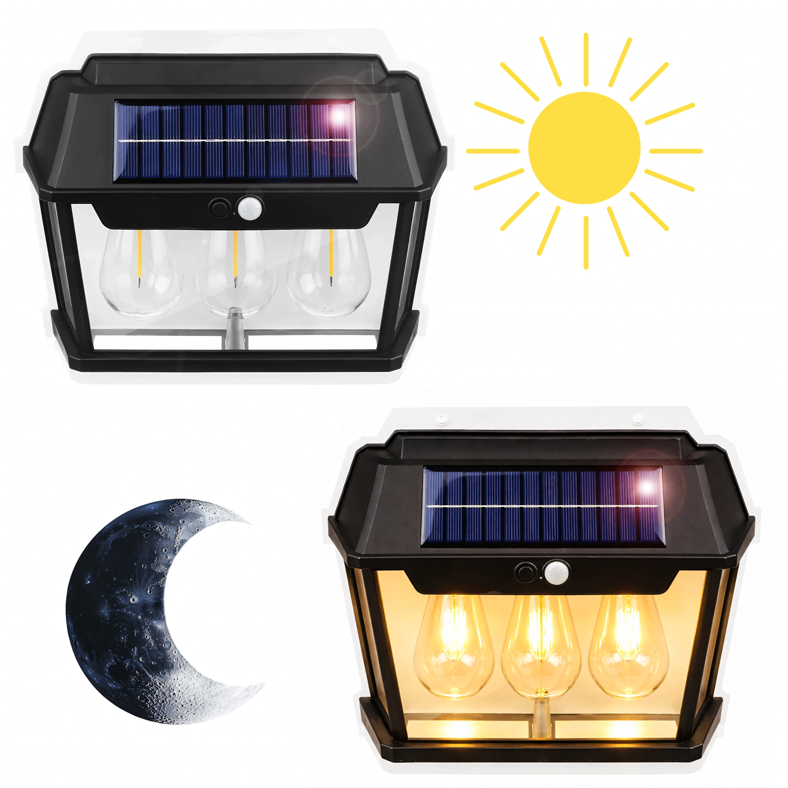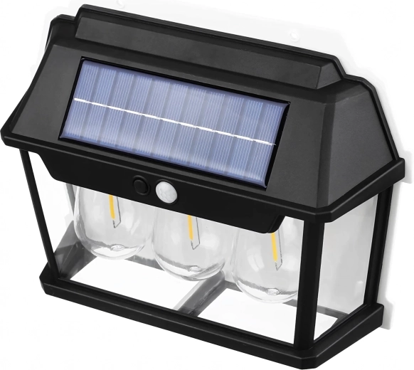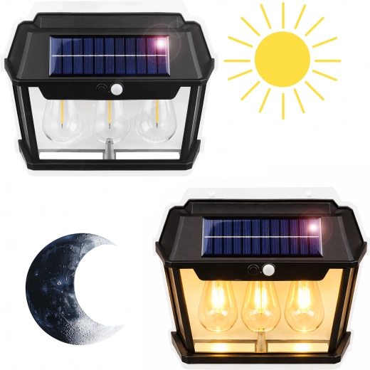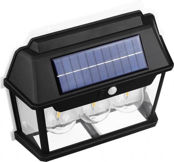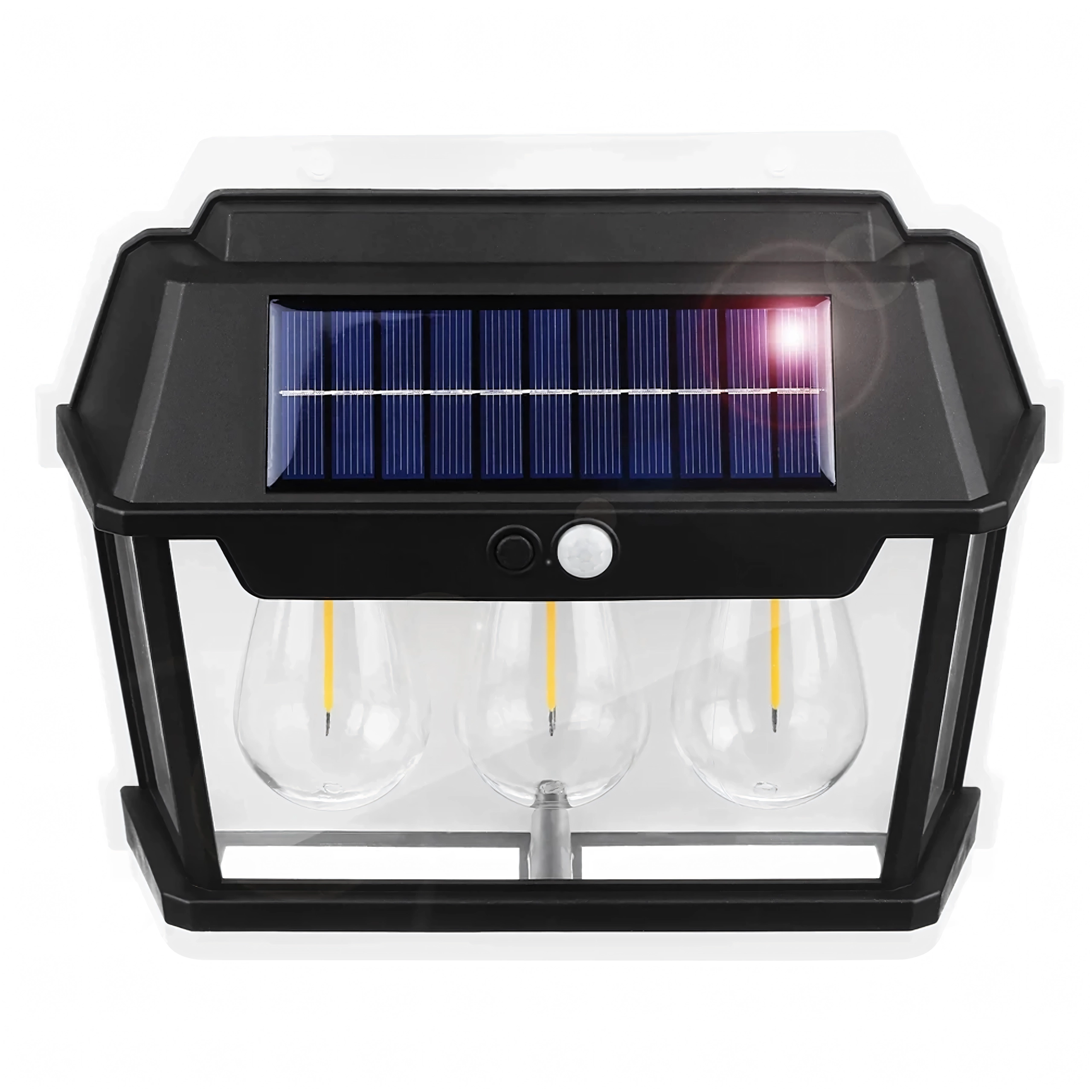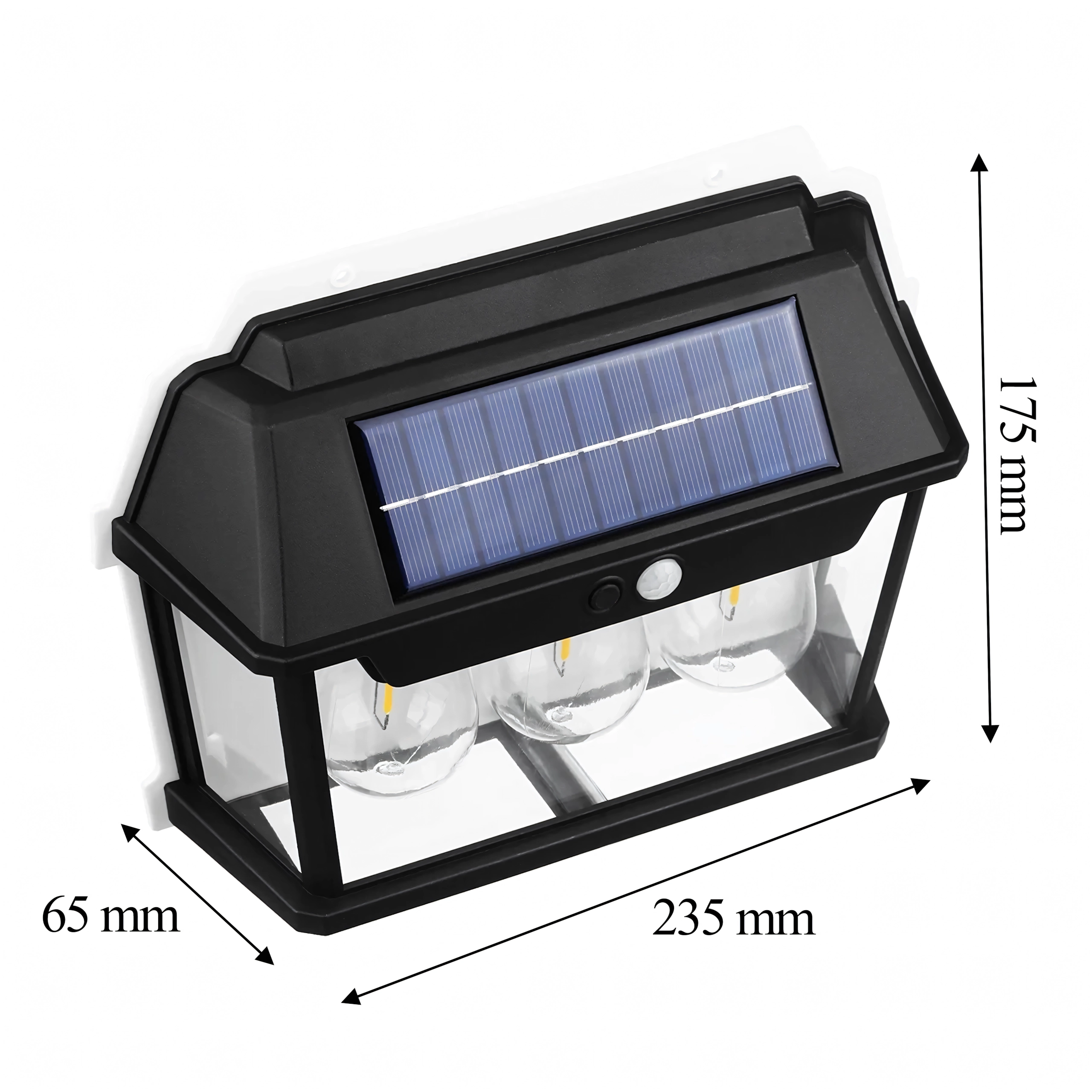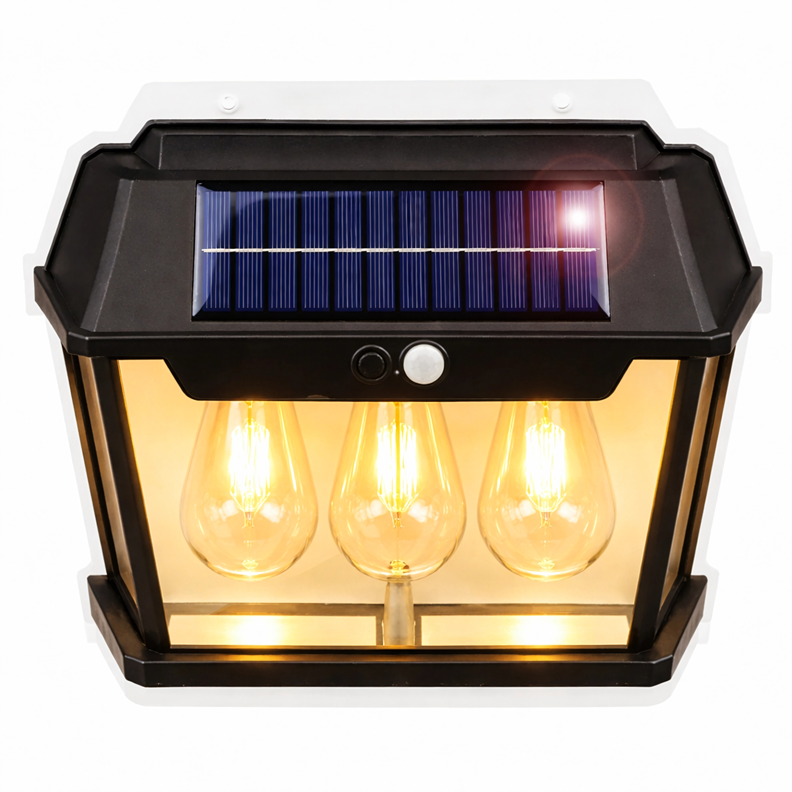 Elegante zonne-wandlamp in lantaarnstijl met drie LED-bronnen zorgt voor automatische verlichting zonder bekabeling. Het geïntegreerde zonnepaneel laadt overdag op en activeert ’s avonds energiezuinig warm licht, dat bij detectie van beweging feller oplicht. De duurzame constructie is geschikt voor buiten aan gevels, terrassen, balkons of entrees.