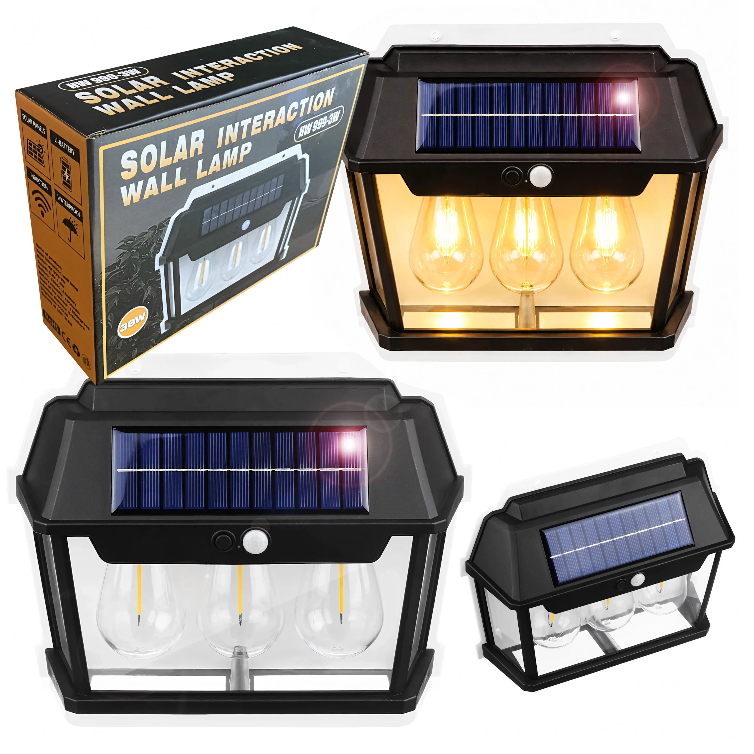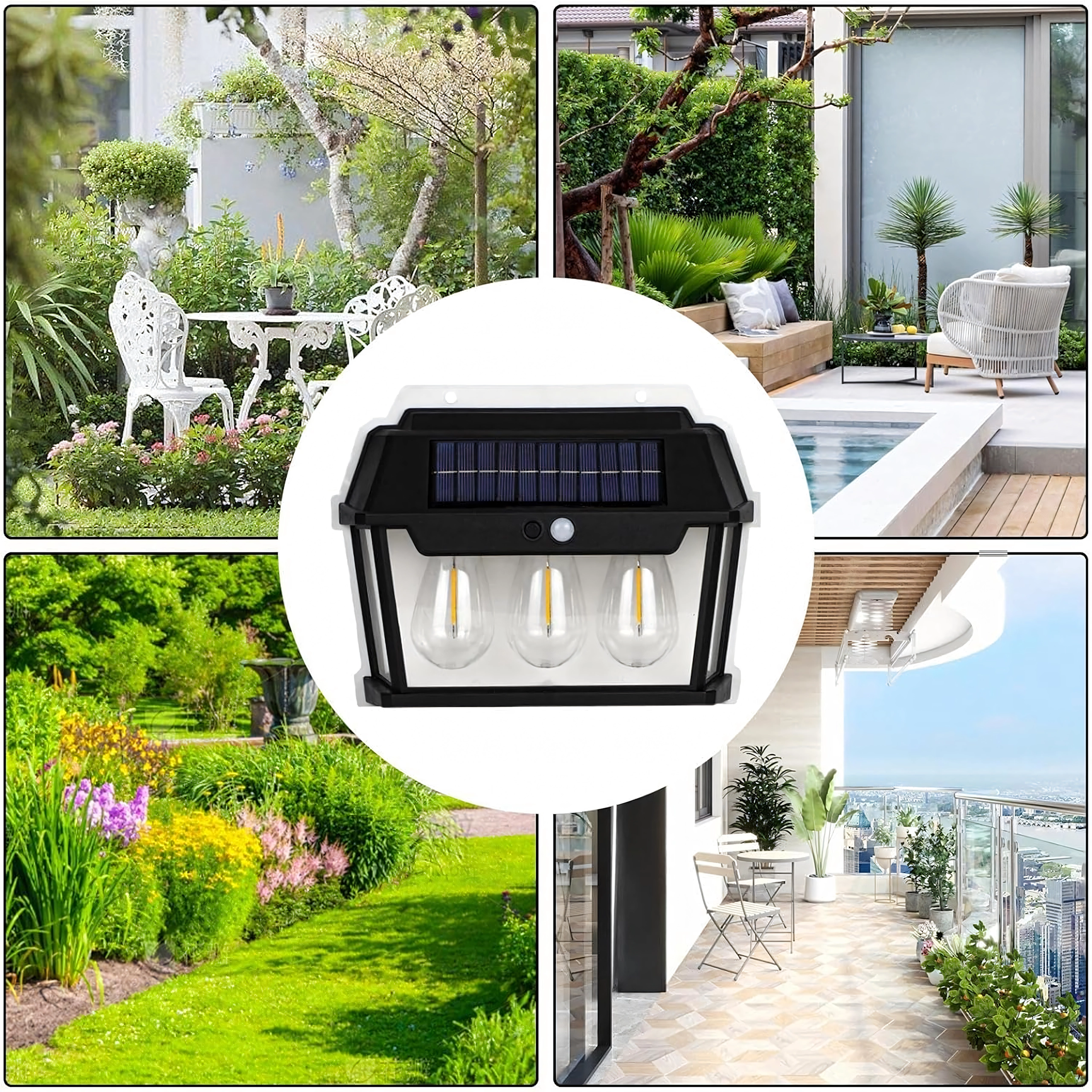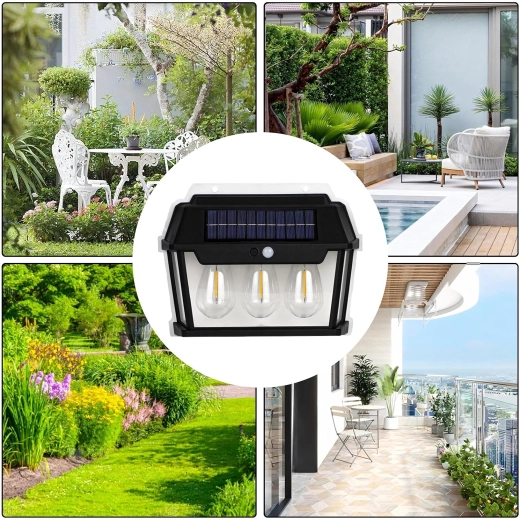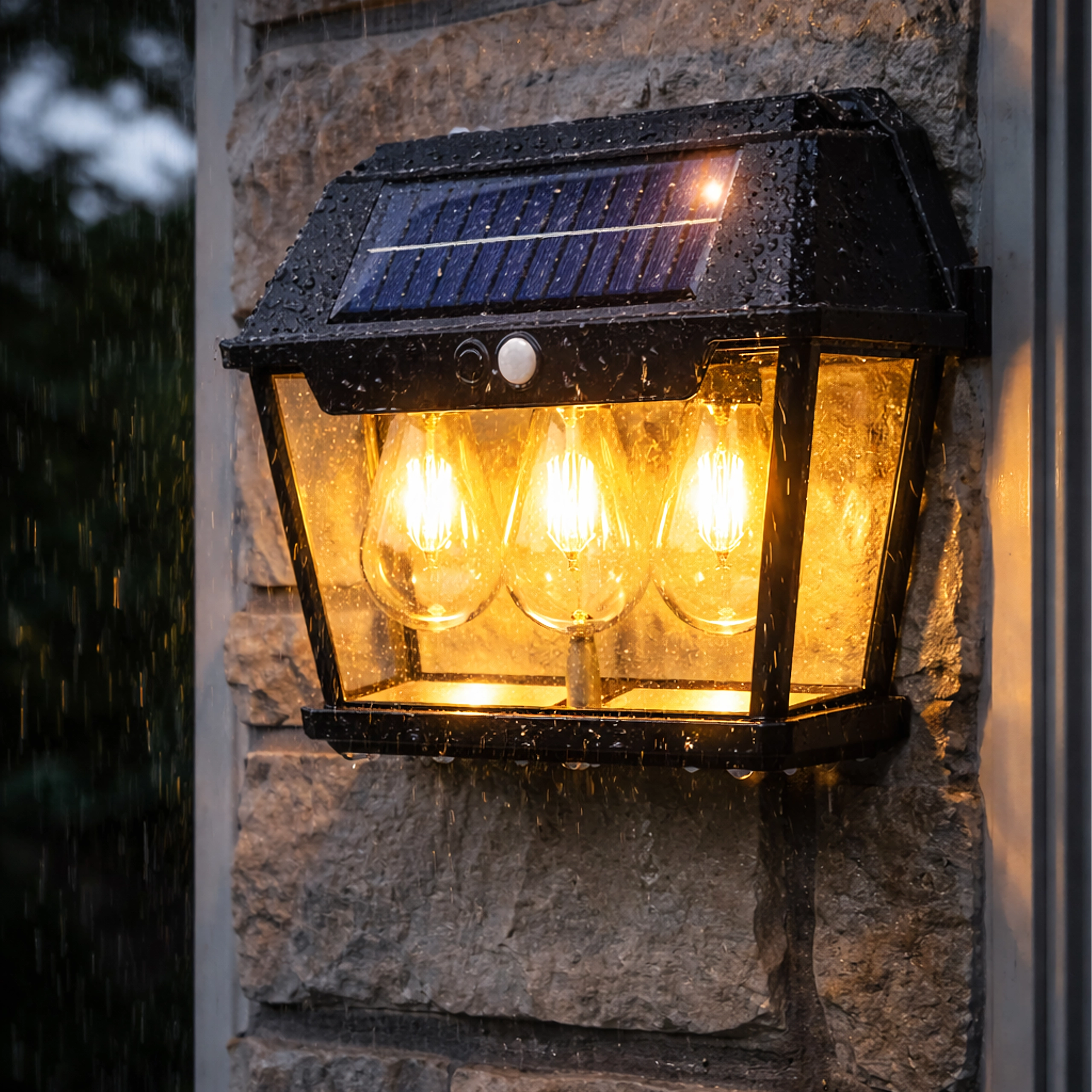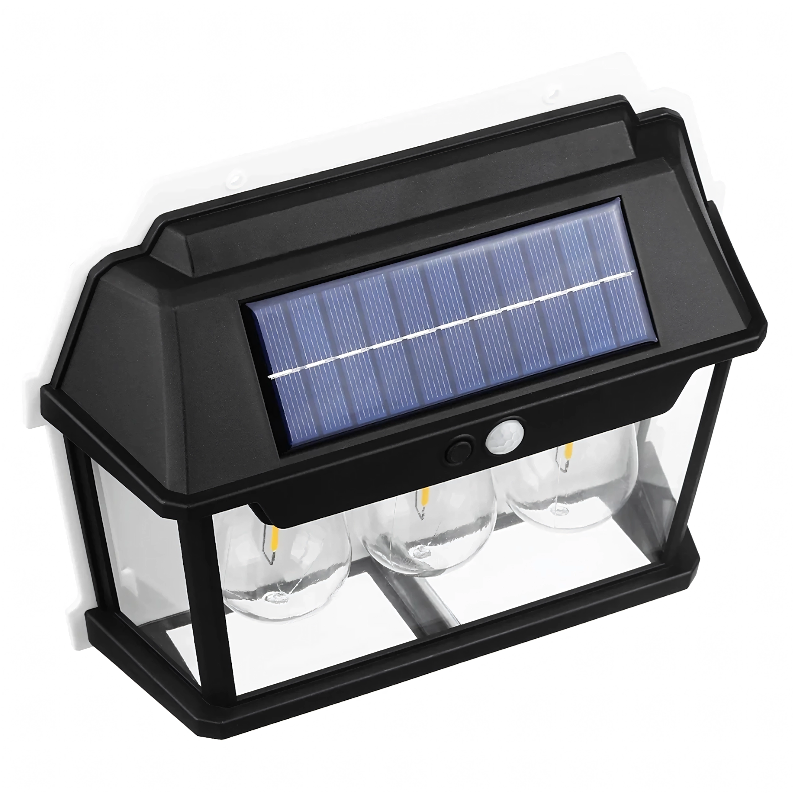 Elegante zonne-wandlamp in lantaarnstijl met drie LED-bronnen zorgt voor automatische verlichting zonder bekabeling. Het geïntegreerde zonnepaneel laadt overdag op en activeert ’s avonds energiezuinig warm licht, dat bij detectie van beweging feller oplicht. De duurzame constructie is geschikt voor buiten aan gevels, terrassen, balkons of entrees.