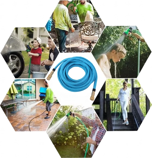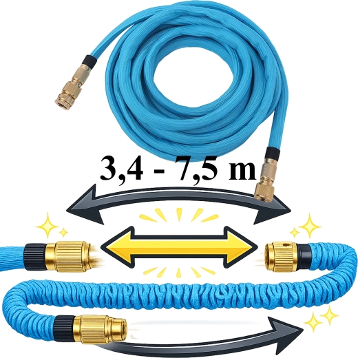 De slang verlengt tot 7,5 m tijdens waterdoorstroming en krimpt na het afsluiten weer in voor ruimtebesparende opslag. Ideaal voor tuin, terras en autowassen.