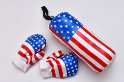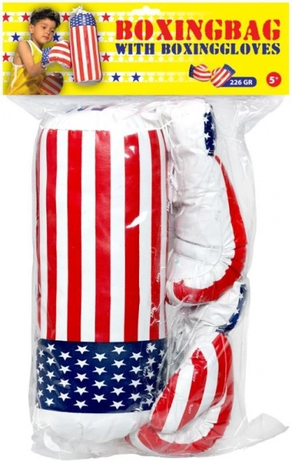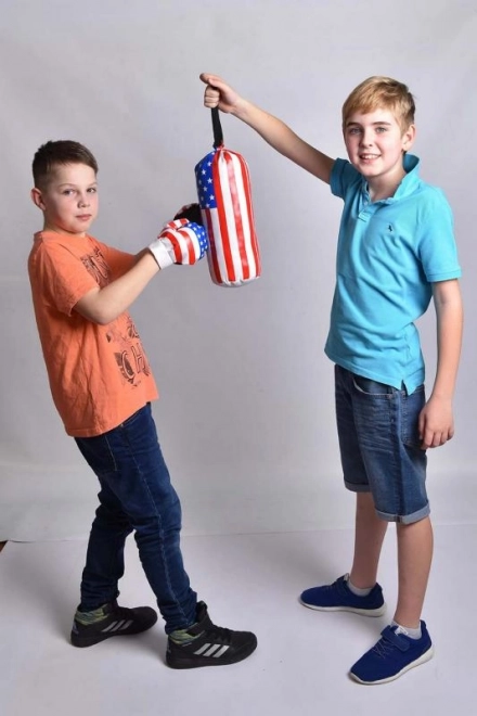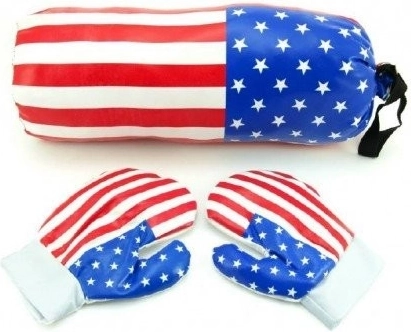De handschoenen hebben een maat die perfect geschikt is voor kleine kinderhanden. Zak en handschoenen met motieven van de Amerikaanse vlag zullen elke kleine strijder vermaken. Het speelgoed is gemaakt van zacht materiaal, dus u hoeft zich geen zorgen te maken over mogelijke verwondingen. Het ontwikkelt kinderbekwaamheid en verbeeldingskracht en stimuleert gezonde beweging bij het kind.