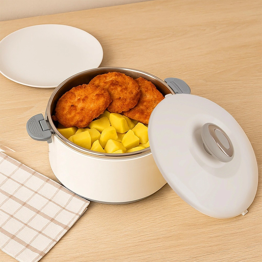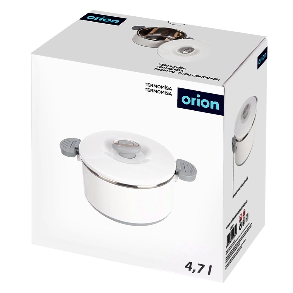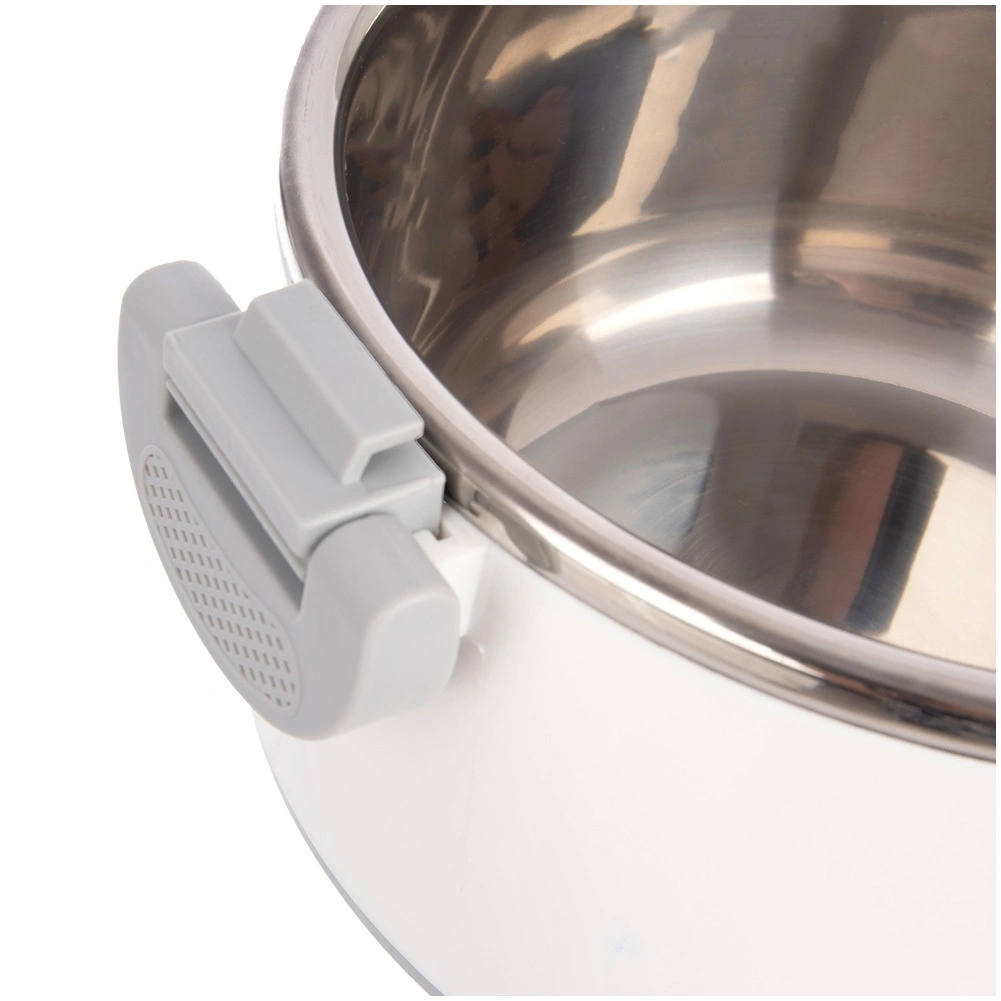 De grote inhoud van 4,2 l biedt ruimte voor volledige maaltijden, bijgerechten en desserts. Het roestvrijstalen interieur houdt de temperatuur goed vast, terwijl de stevige witte kunststof buitenkant en de grijze handgrepen voor comfortabel en veilig hanteren zorgen. Het deksel sluit door draaien en de zijclips verhogen de zekerheid tijdens het dragen.