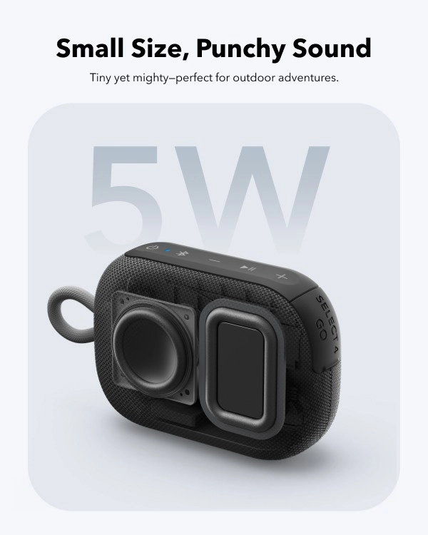 De Soundcore Select 4 Go is de ideale metgezel voor reizen, uitstapjes en luisterplezier thuis. De compacte behuizing levert een helder en dynamisch geluid met 5 W vermogen, dat verrassend vol klinkt voor zijn formaat. Dankzij de accuduur tot 20 uur geniet je de hele dag van muziek zonder op te laden.