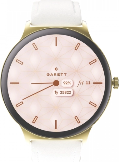 GARETT VERONA 2 is een dames-smartwatch met een slanke behuizing (slechts 7,5 mm) die perfect past bij zowel dagelijkse als avondoutfits. De verwisselbare gouden mesh-armband en de witte leren band in de verpakking laten je stijl direct aanpassen aan de gelegenheid. De bediening is comfortabel dankzij de draaikroon en de overzichtelijke interface.