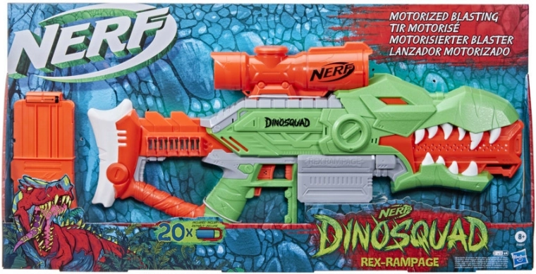 Maak je klaar voor onvergetelijke avonturen met machtige dinosaurussen. Nerf DinoSquad Rex-Rampage combineert een op de T-Rex geïnspireerd design met een hoge vuursnelheid. Dankzij het gemotoriseerde systeem en het magazijn voor 10 darts kun je snel en nauwkeurig je doelen raken.