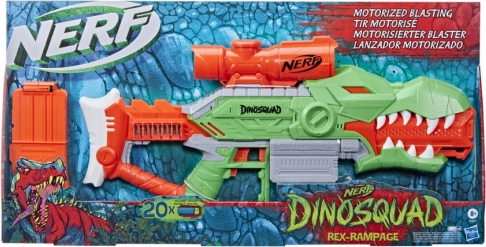 Sluit je aan bij de legendarische dinosauruscrew met de Nerf DinoSquad Rex-Rampage! Deze blaster heeft een indrukwekkend design geïnspireerd op de Tyrannosaurus Rex en maakt snelle actie mogelijk dankzij het gemotoriseerde systeem.