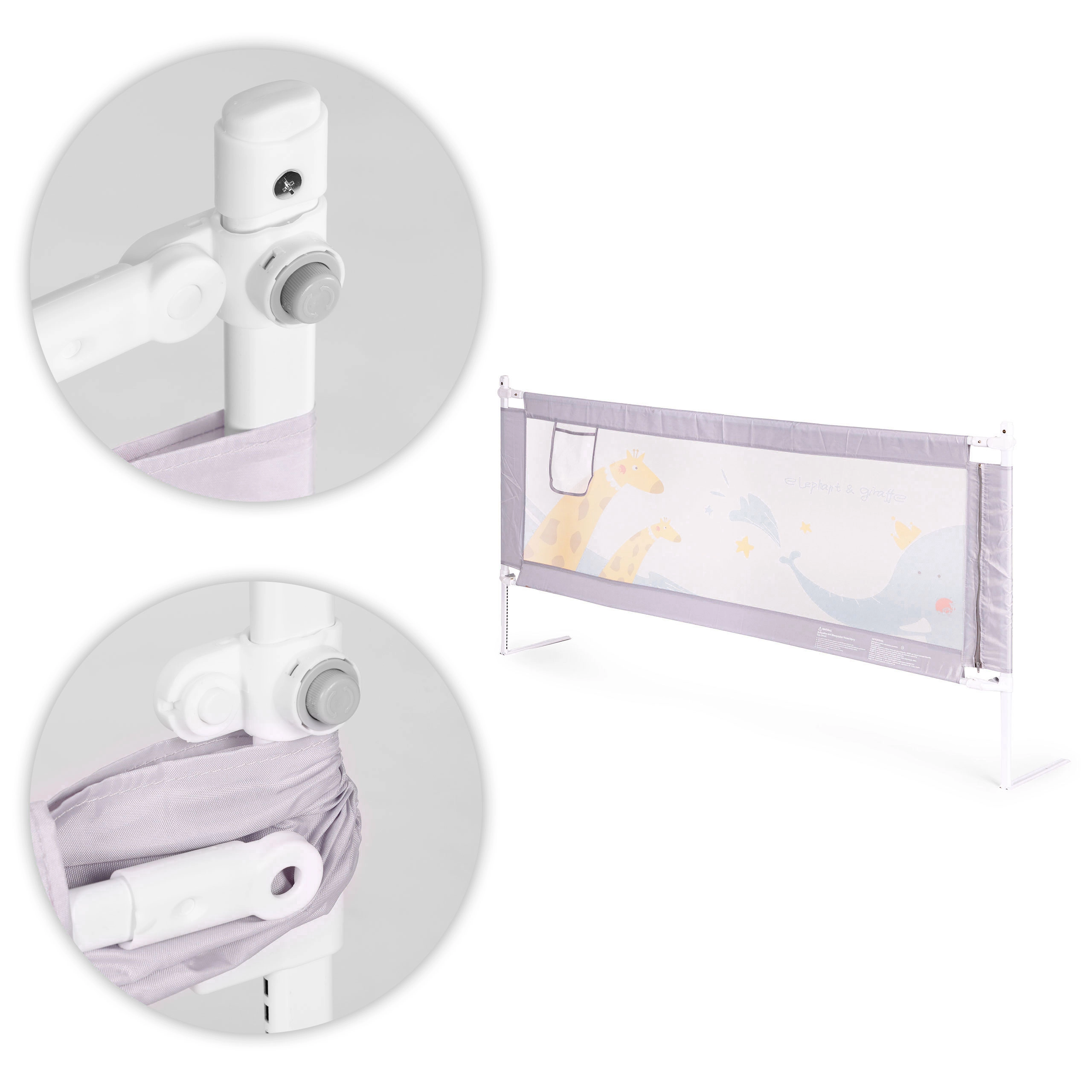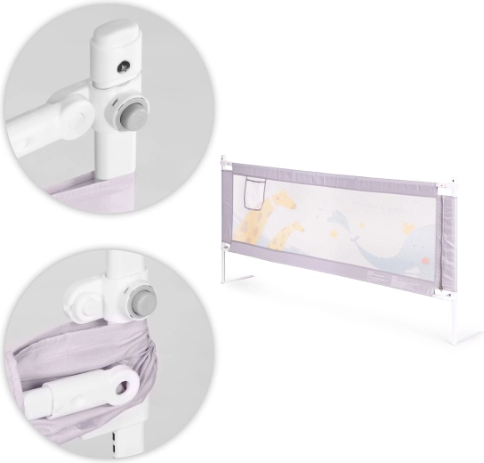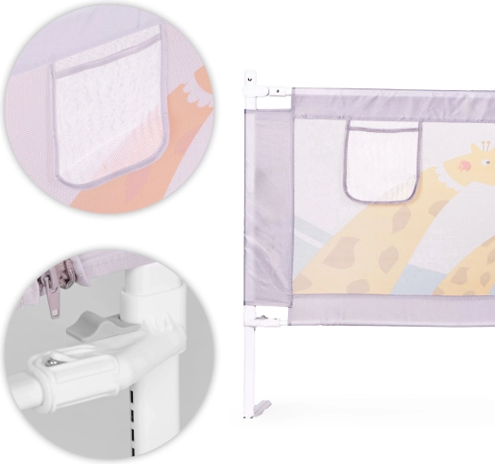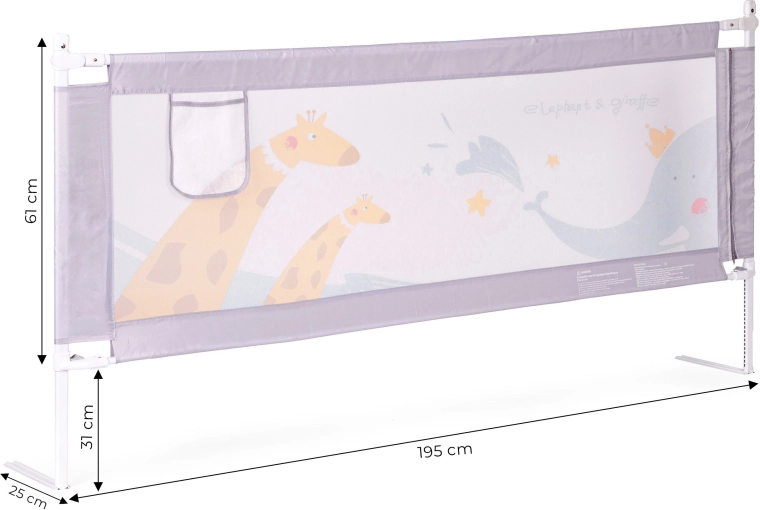 Dankzij de universele montage en de mogelijkheid tot koppeling van meerdere randen creëer je eenvoudig een veilige, knusse zone aan elke zijde van het bed. Duurzame materialen (staal, 210D Oxford textiel, polyester) garanderen een lange levensduur en eenvoudig onderhoud – de hoes is afneembaar en wasbaar. Het subtiele dierenmotief past in elke kinderkamer en het zakje voor speen, doekjes of speelgoed houdt benodigdheden binnen handbereik.