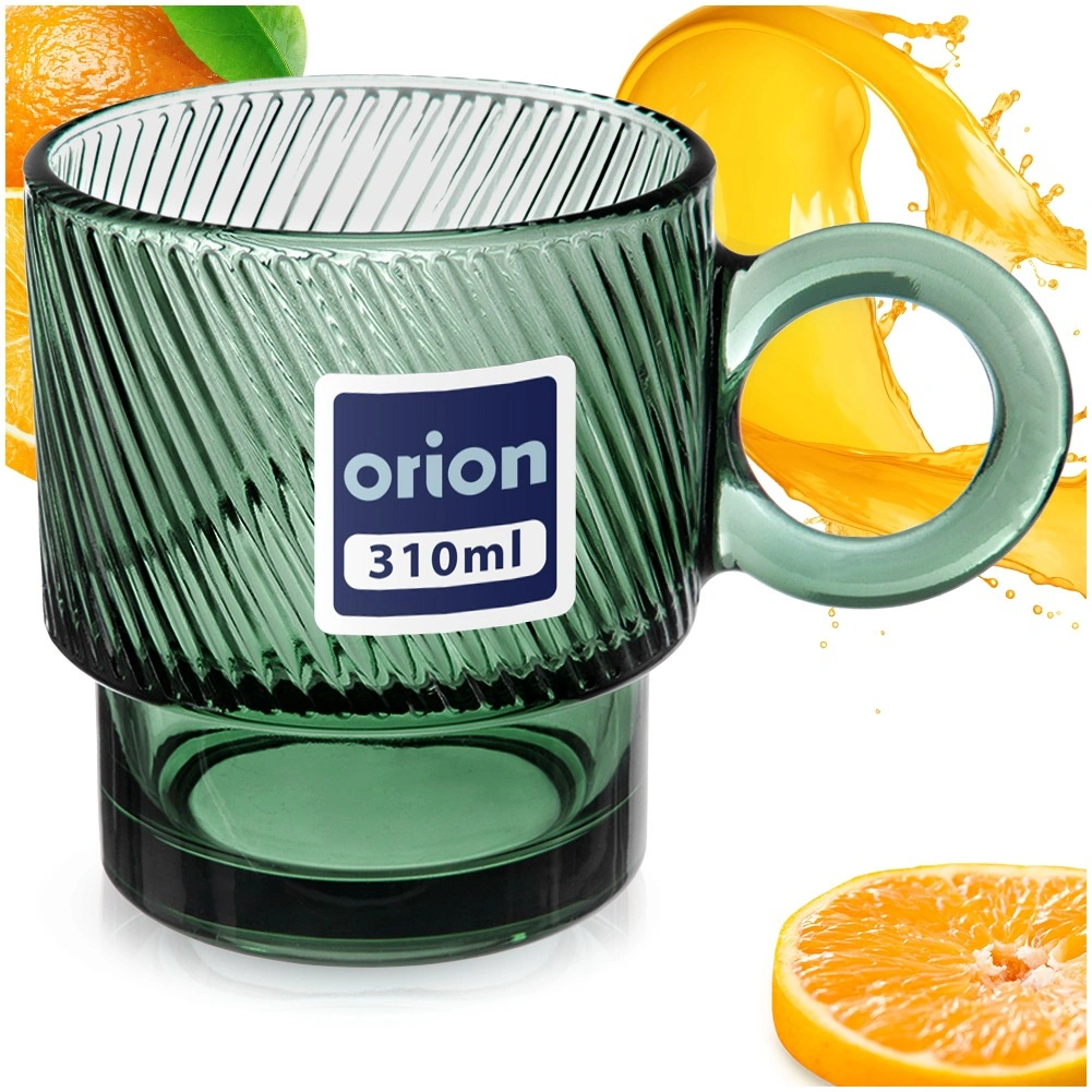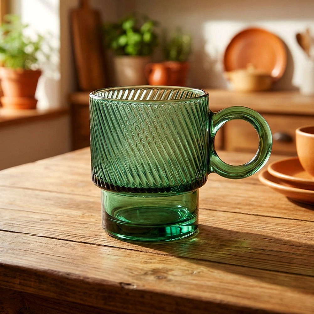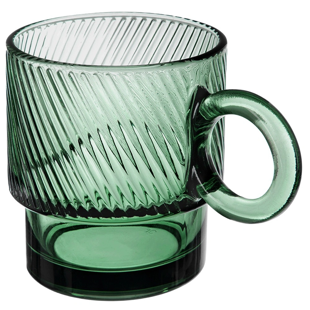 Stijlvolle groene mok van duurzaam glas met een inhoud van 300 ml voor dagelijkse koffie, thee en koude dranken. Het getextureerde ribbelpatroon voegt elegantie toe en zorgt voor een zekere grip, het comfortabele oor maakt hanteren makkelijk en het glas is vaatwasmachinebestendig. Ideaal voor thuis, cafés en restaurants.