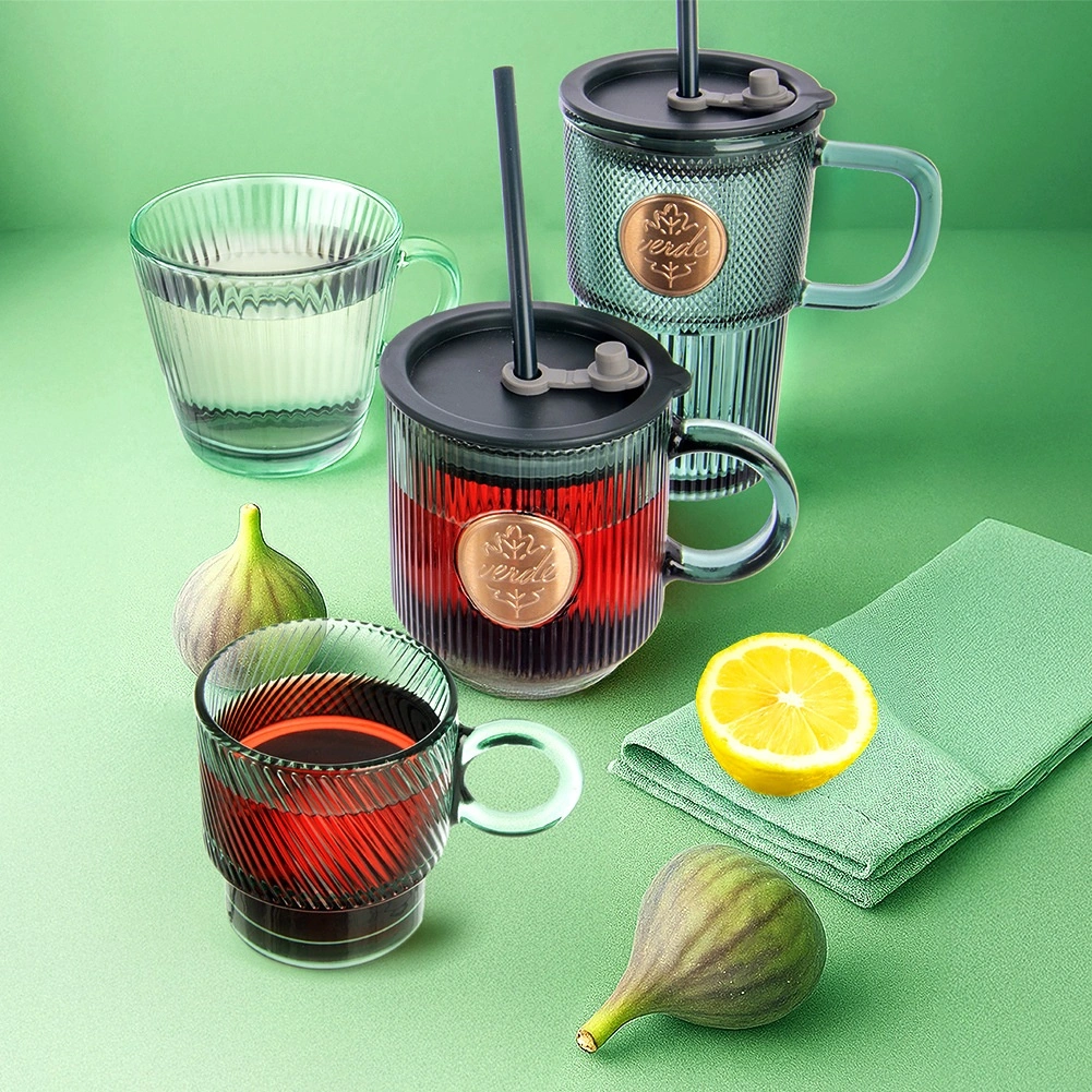 De elegante VERDE-mok van transparant groen glas combineert een modern uiterlijk met praktische bruikbaarheid. Het geribde oppervlak verbetert de grip, de dikkere bodem verhoogt de stabiliteit en de strakke lijnen passen in elke keuken.