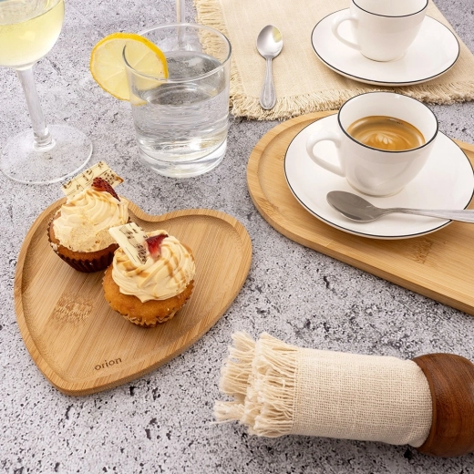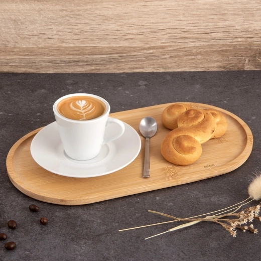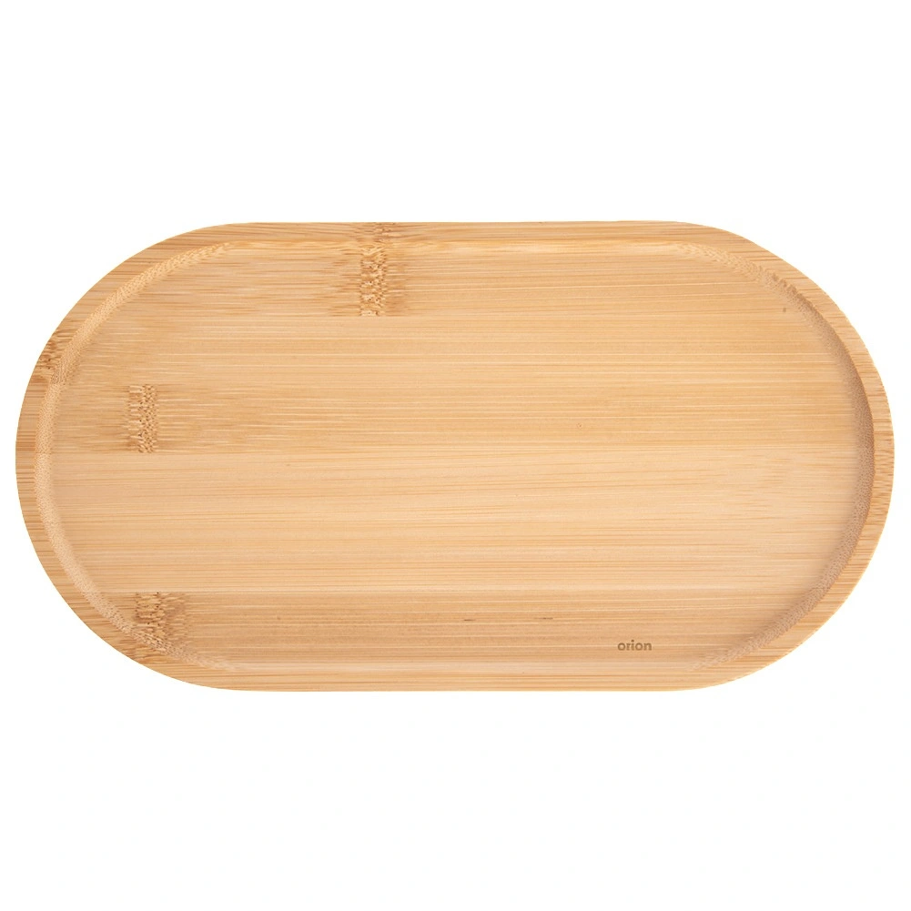 Ontdek het minimalistische maar opvallende bamboe serveerbord in ovale vorm met afmetingen 28 × 15 × 1 cm. Perfect voor het serveren van desserts, sandwiches, kazen, fruit en snacks, en ook om kopjes en kannetjes op te zetten. Dankzij het gladde oppervlak en de verhoogde rand is het ook uitstekend als decoratief dienblad voor kaarsen of seizoensdecoraties.