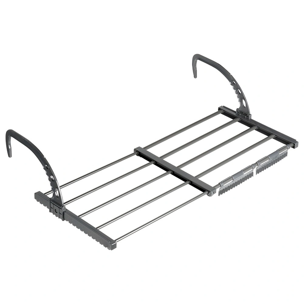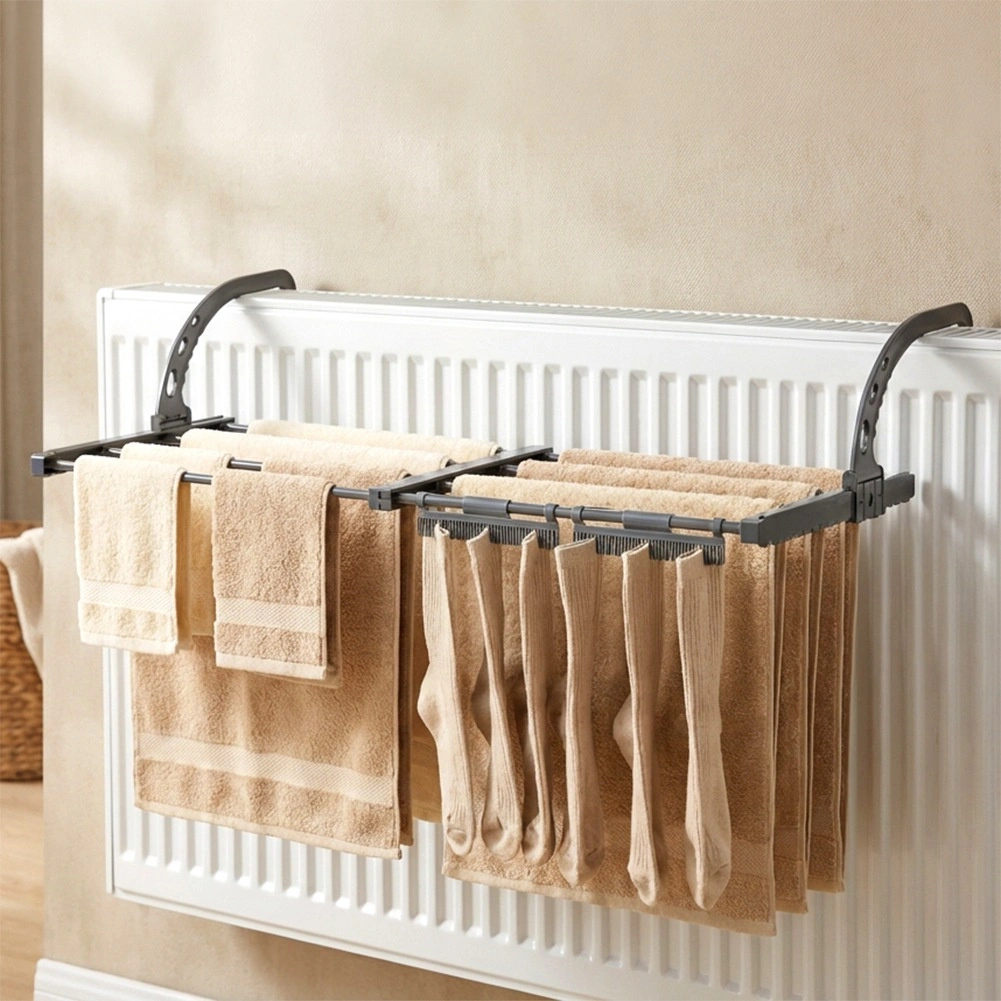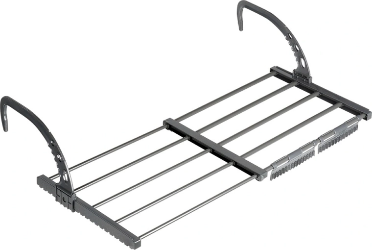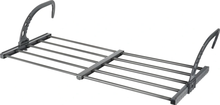 Dankzij de inklapbare, in hoogte verstelbare haken hang je het gemakkelijk aan een radiator met een breedte tot 13 cm, maar ook aan balkon- of terrasleuningen. Twee meegeleverde houders vergemakkelijken het drogen van klein wasgoed en sokken. Opgevouwen neemt het minimaal ruimte in, dus ook ideaal voor op reis.