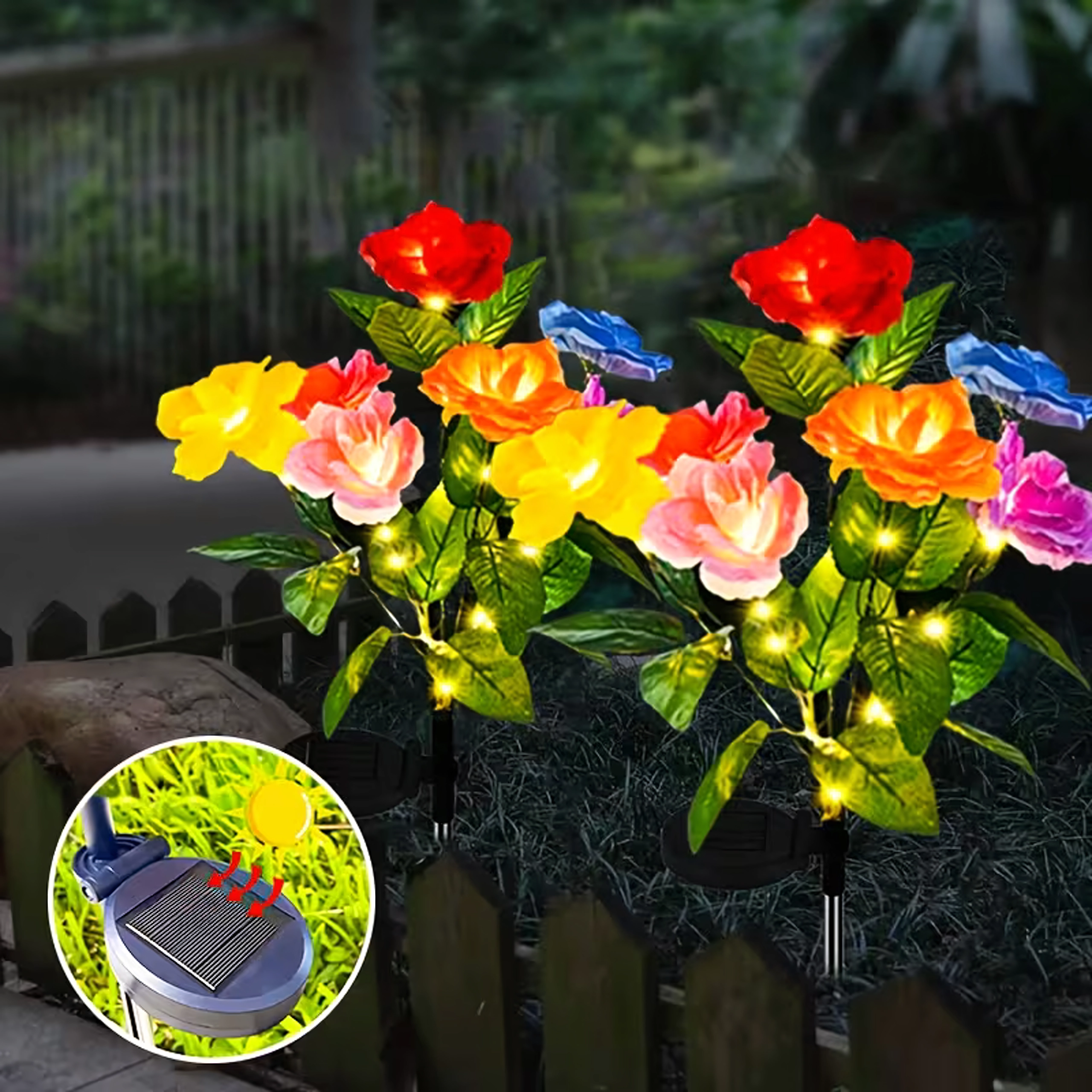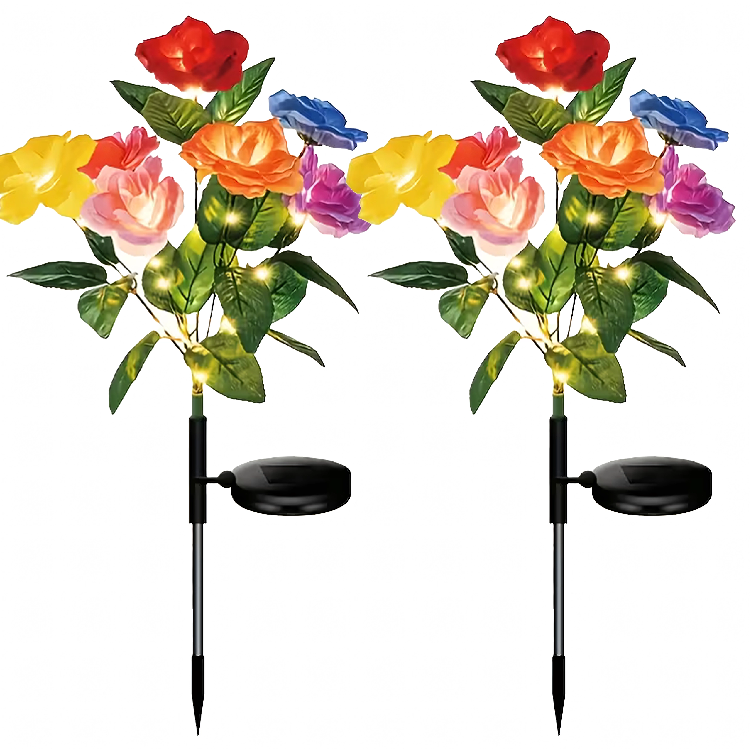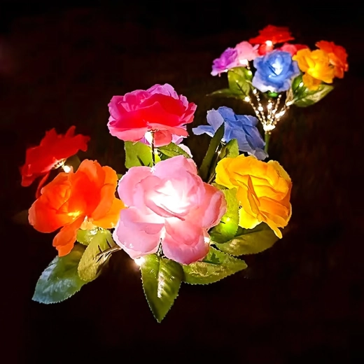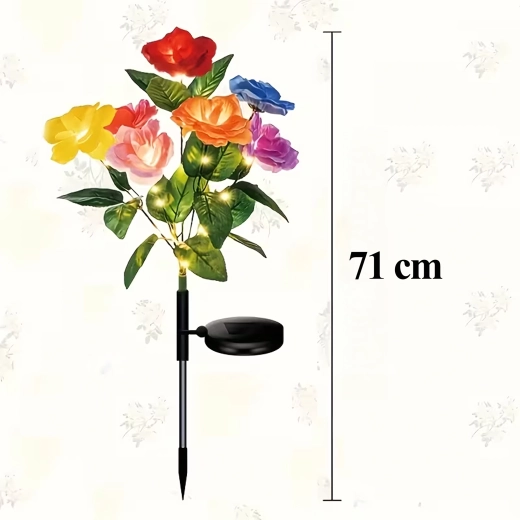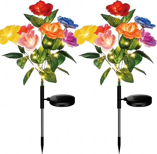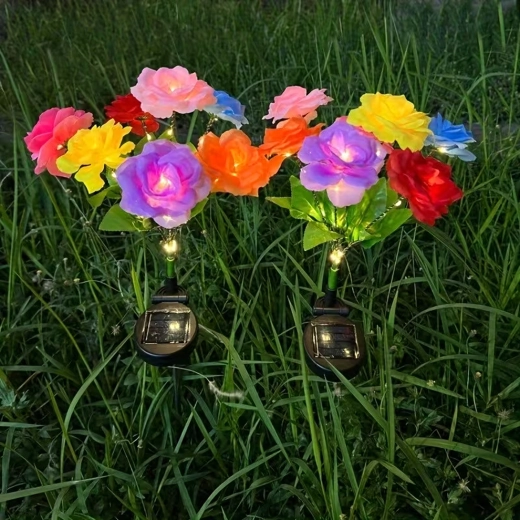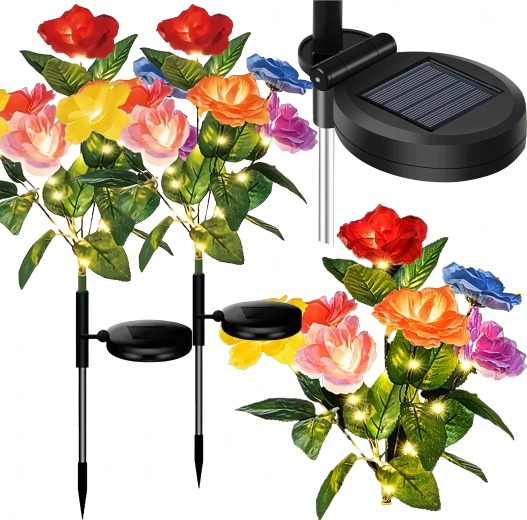 Deze decoratieve zonnelampen brengen kleur en zacht avondlicht naar buiten. Realistische rozenbloemen in meerdere tinten zijn verweven met delicate micro-LED’s die, na opladen in de zon, automatisch aangaan bij schemering. Dankzij de zonnevoeding zijn de lampen zuinig en onderhoudsvrij – gewoon in de grond steken.