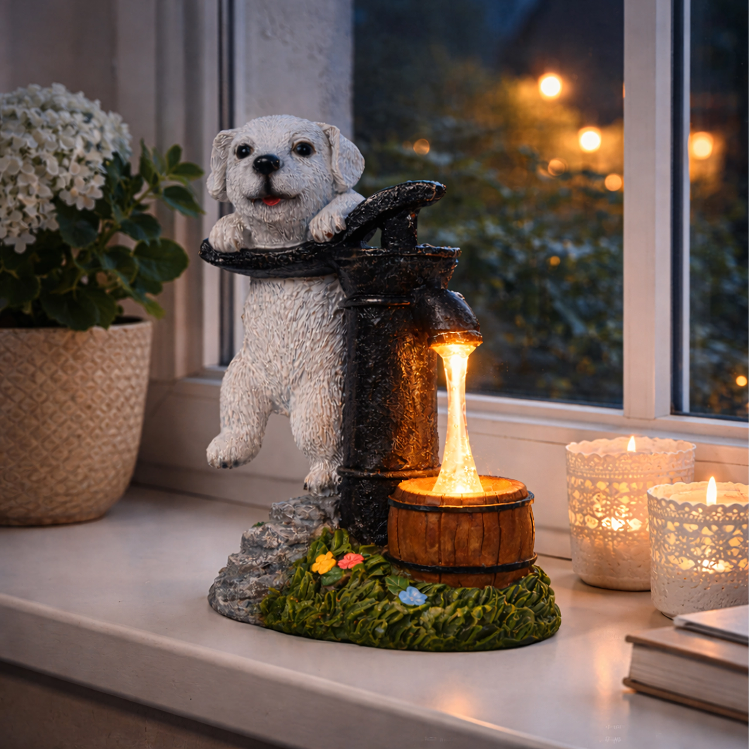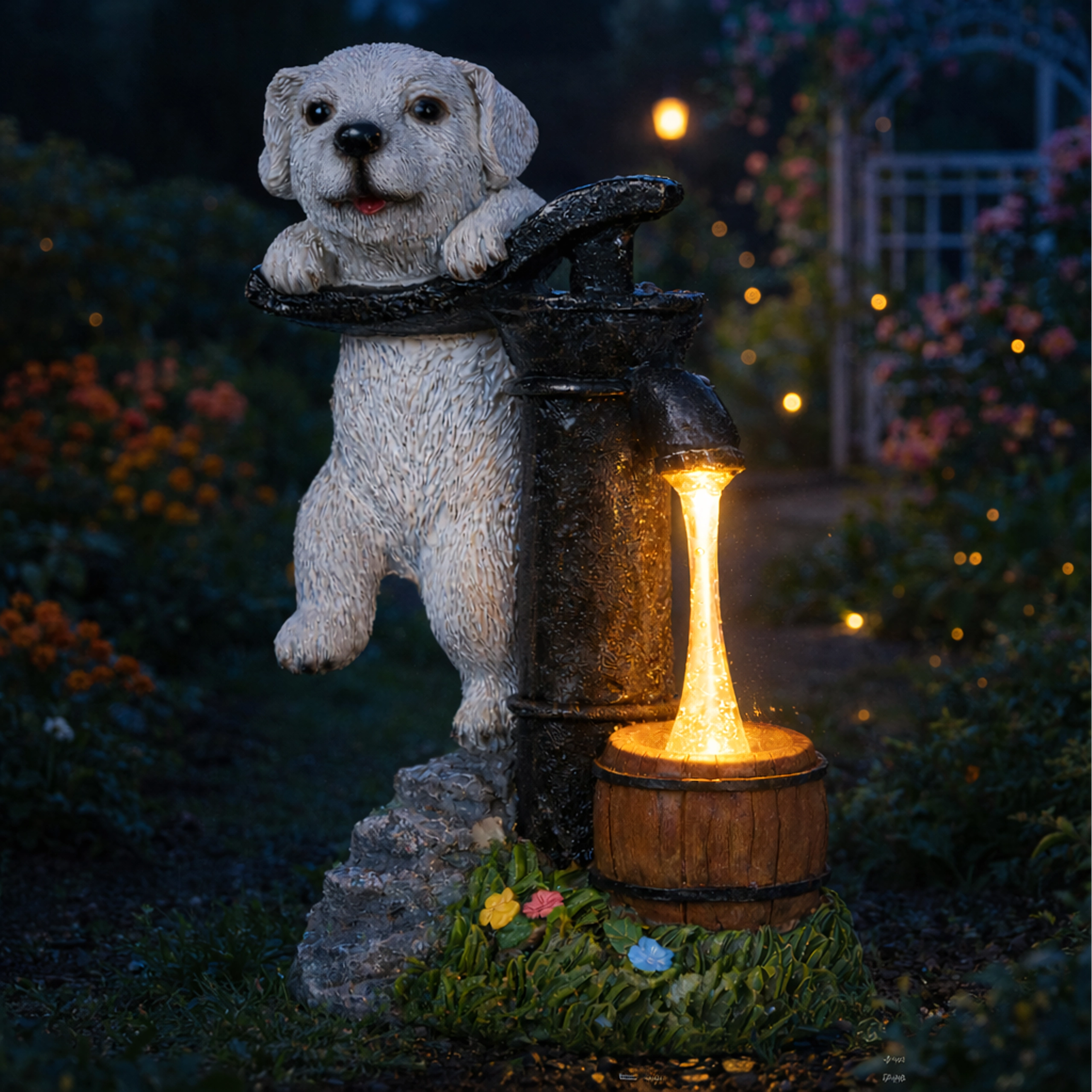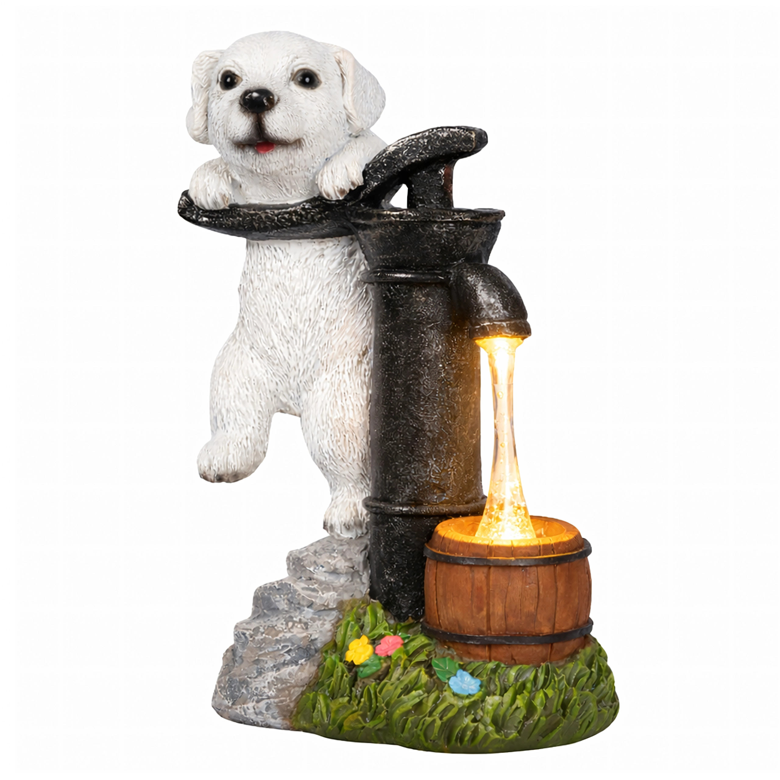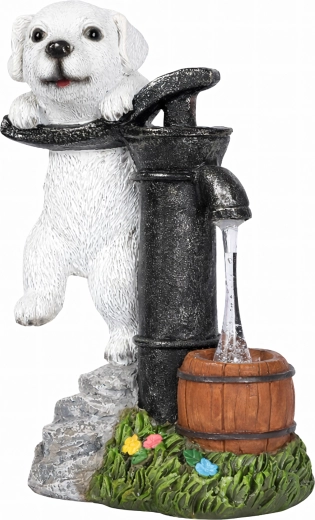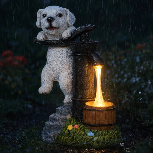 Stijlvolle tuindecoratie die de charme van een vintage handpomp met een leunend puppy combineert met praktische LED-verlichting. Het warmwitte licht wekt de illusie van een waterstroompje in een klein houten tonnetje, waardoor je buitenruimte ’s avonds een aangename, sfeervolle gloed krijgt zonder ingewikkelde installatie.