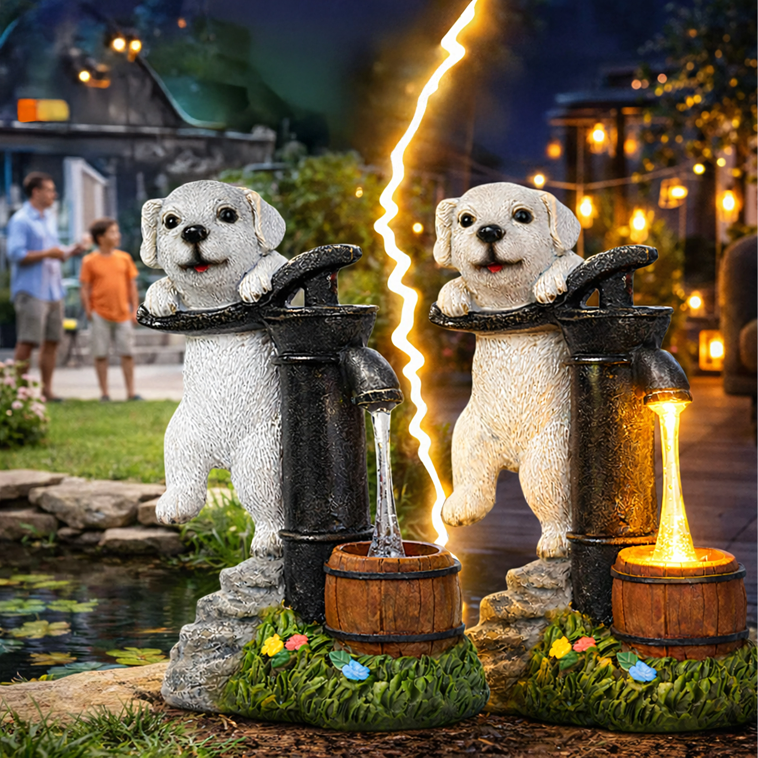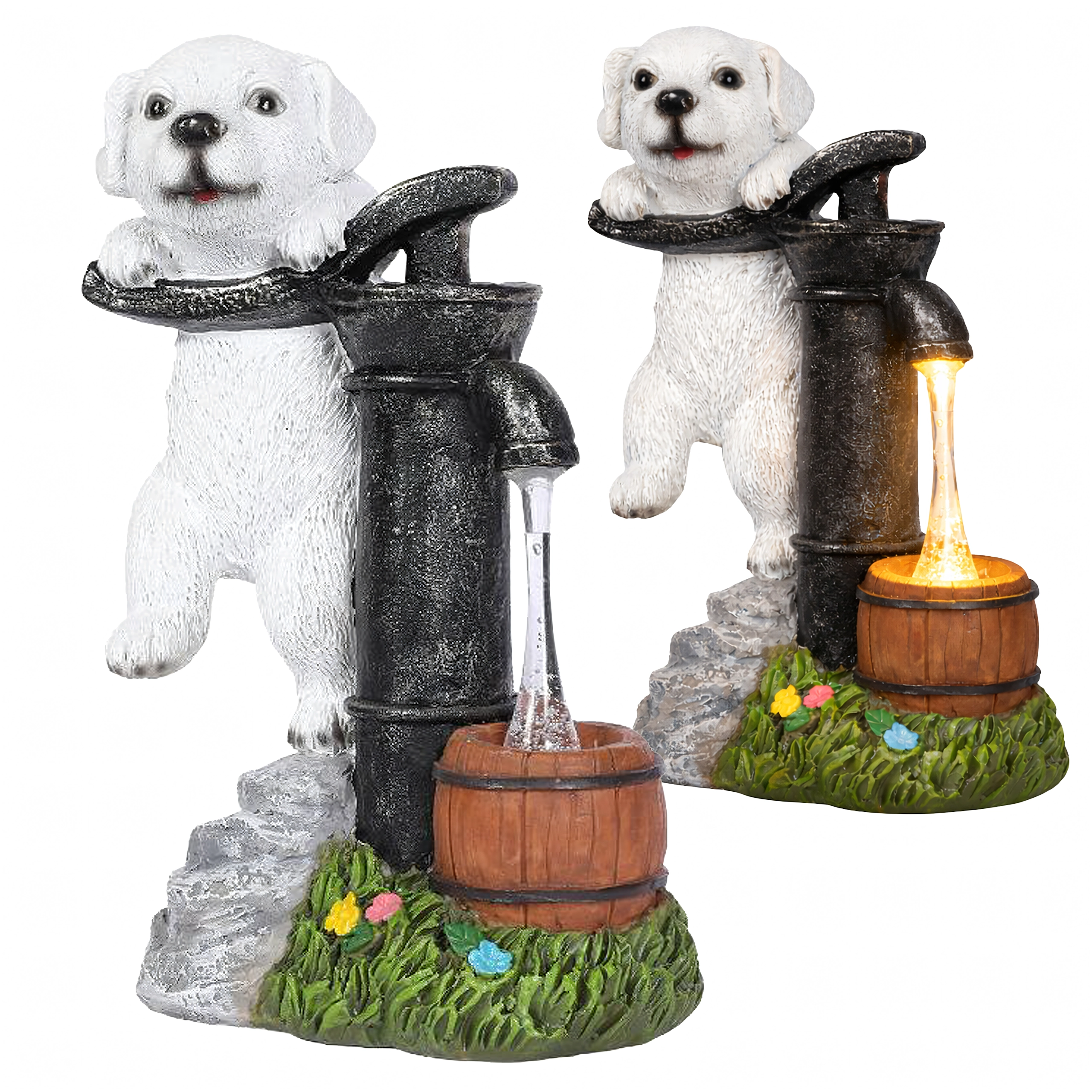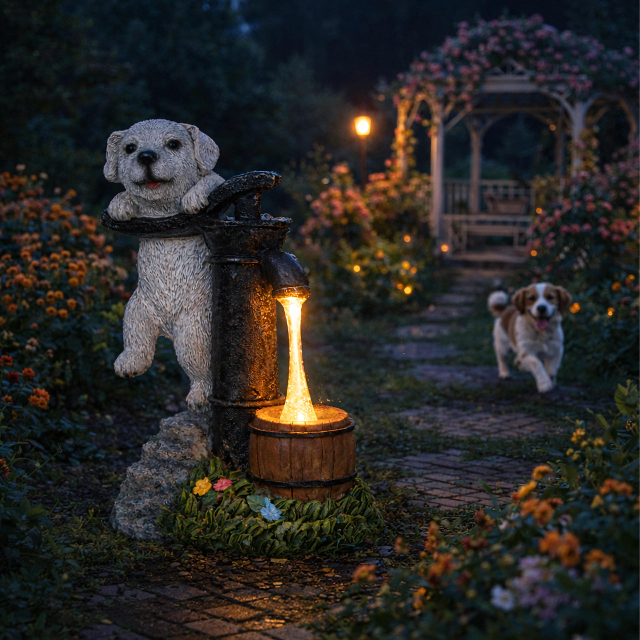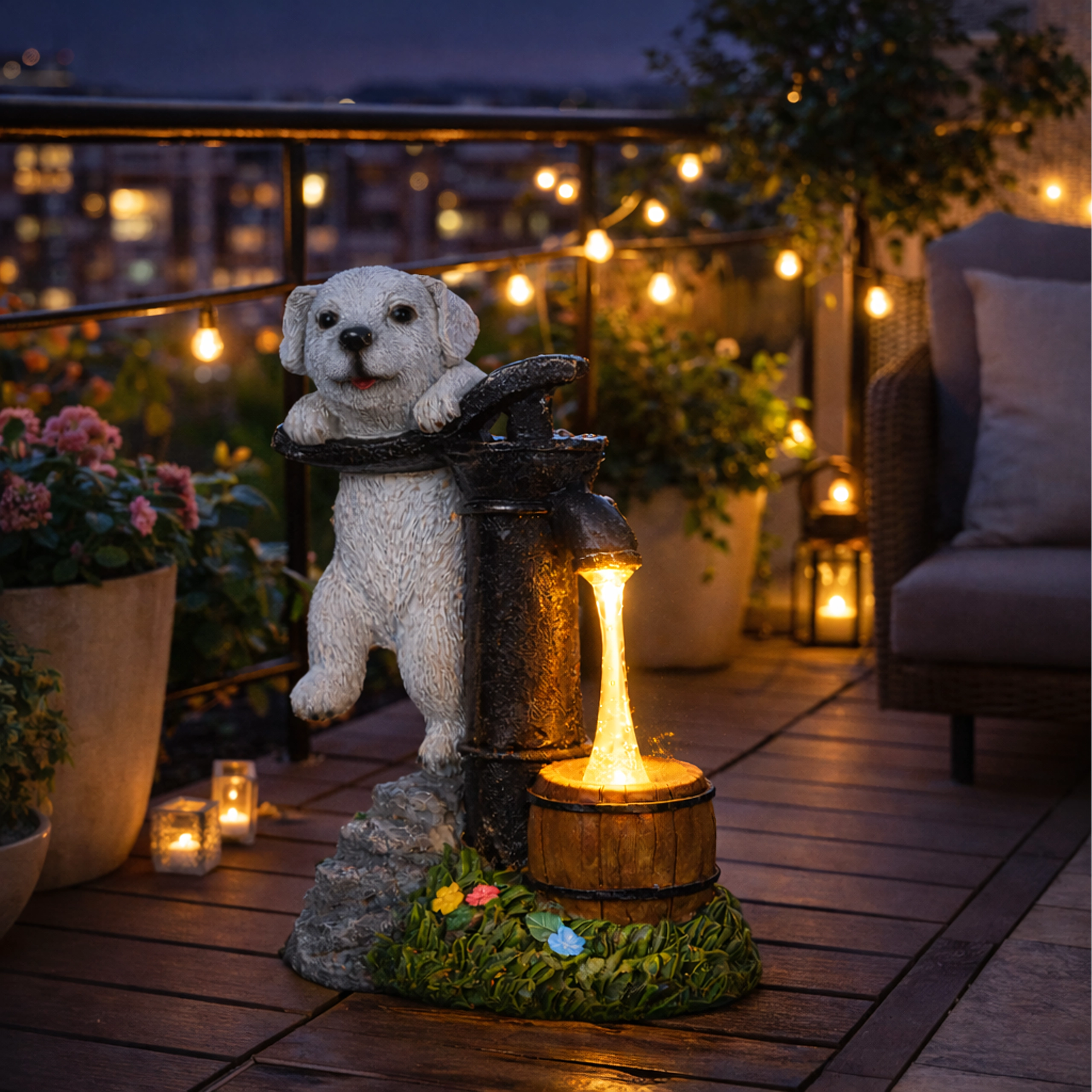 Stijlvolle tuindecoratie die de charme van een vintage handpomp met een leunend puppy combineert met praktische LED-verlichting. Het warmwitte licht wekt de illusie van een waterstroompje in een klein houten tonnetje, waardoor je buitenruimte ’s avonds een aangename, sfeervolle gloed krijgt zonder ingewikkelde installatie.
