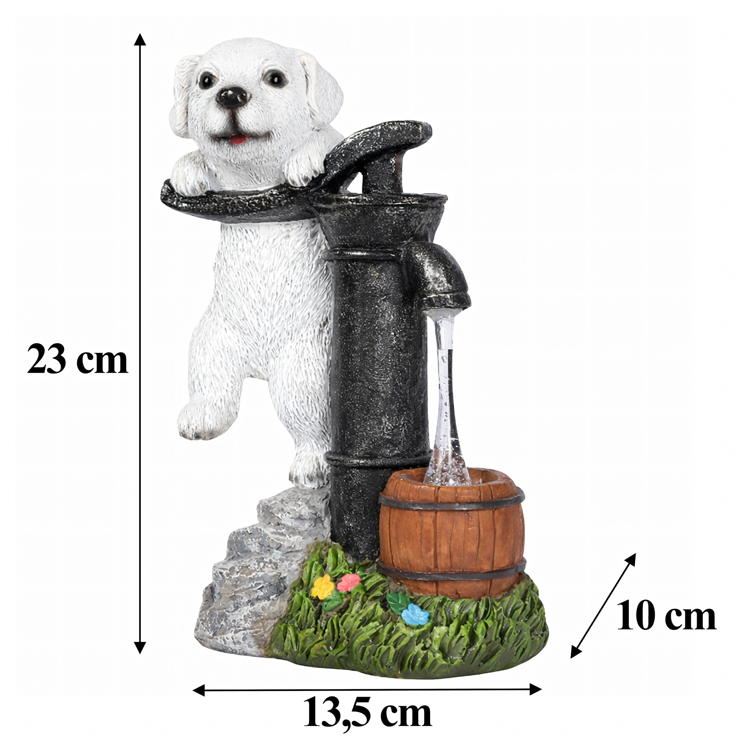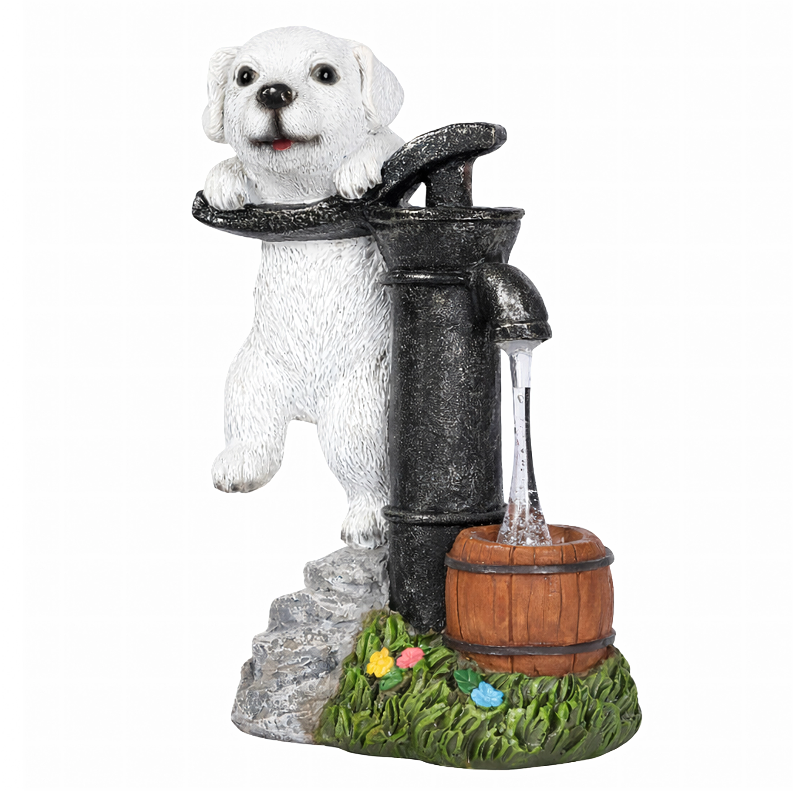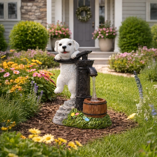 Realistische puppyfiguur bij een oude pomp met houten ton, steen- en grastextuur past perfect langs paden, bij bloembedden en op het terras.