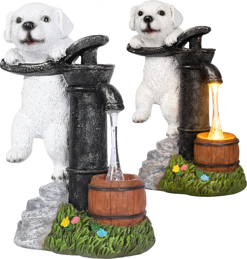 Schattige solar tuinlamp met een puppyfiguur bij een retro pomp geeft je tuin een betoverende sfeer. Dankzij de ingebouwde warmwitte LED gaat hij ’s avonds branden en imiteert hij stromend water in een houten tonnetje. Ideaal als buitendecoratie langs het pad, op het terras of bij bloembedden – zonder kabels, met zonne-energie en een duurzame afwerking.