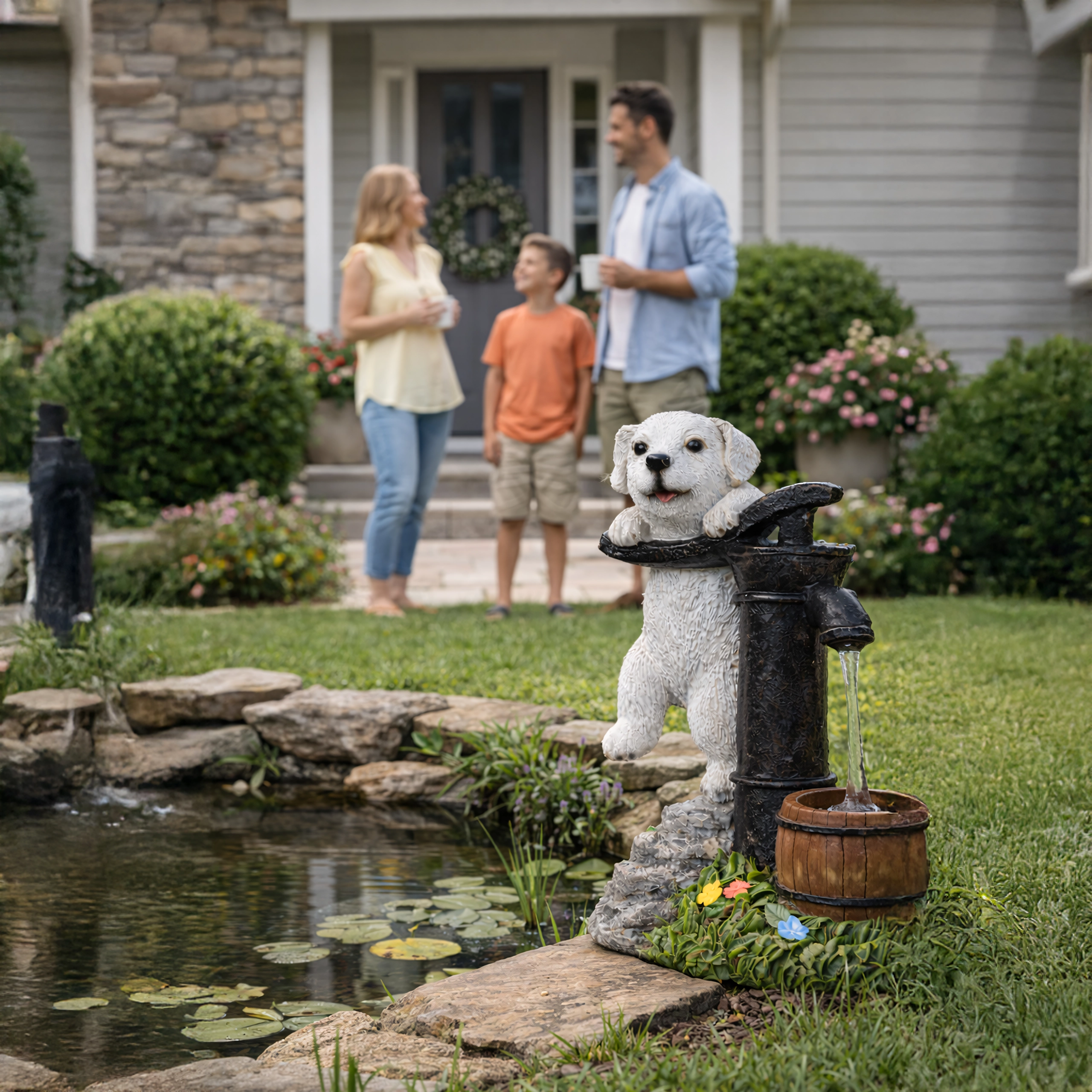- Duurzame tuindecoratie met realistische details van puppy, pomp en ton
