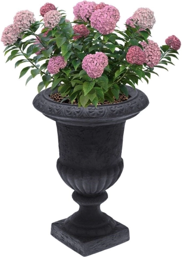 Creëer bij het huis, in de tuin of op het terras een representatieve plek met deze kelkvormige bloempot in modern antraciet. Het oppervlak met steenimitatie oogt tijdloos en is onderhoudsarm – afspoelen met water is voldoende. Dankzij de stabiele voet en brede rand komen weelderige bloemen- en groene arrangementen prachtig tot hun recht.