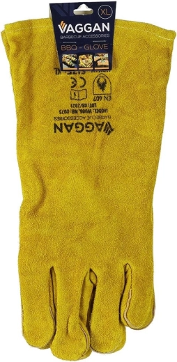 Een paar hoogwaardige leren grillhandschoenen van 34 cm in maat XL beschermt handen en onderarmen betrouwbaar tegen hitte. Dankzij de fleece voering aan de binnenkant zijn ze comfortabel en de zachte leerkwaliteit in mosterdtint is bovendien bestand tegen hoge temperaturen. Ze voldoen aan norm EN 407 en klasse BC, en zijn dus geschikt voor barbecue, oven en kookplaat.