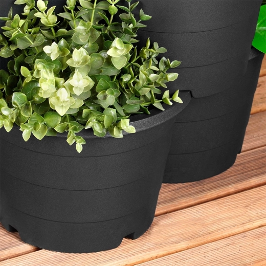 Elk onderdeel biedt plaats aan drie verschillende planten en heeft geïntegreerde drainagegaten die overtollig water afvoeren. De duurzame zwarte kunststof is eenvoudig te reinigen en bestand tegen regen, wind en UV-straling, zodat je de bloempotten het hele jaar buiten kunt gebruiken.
