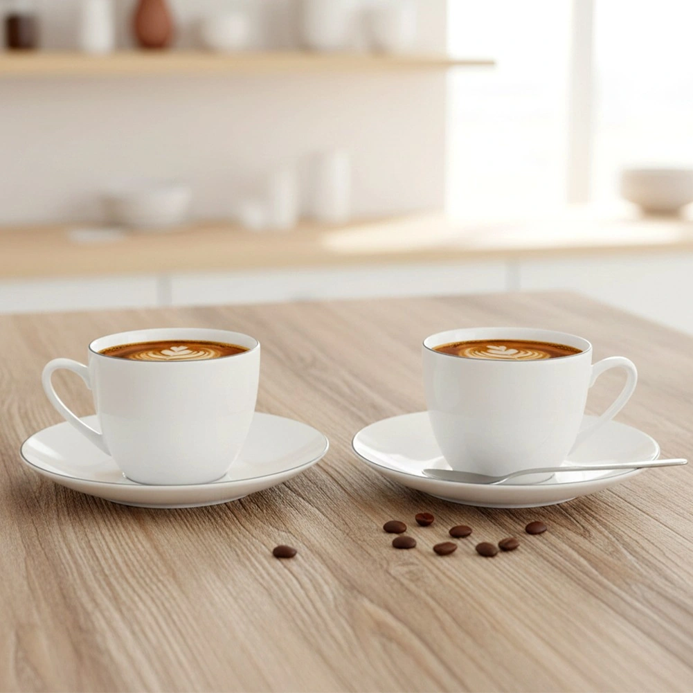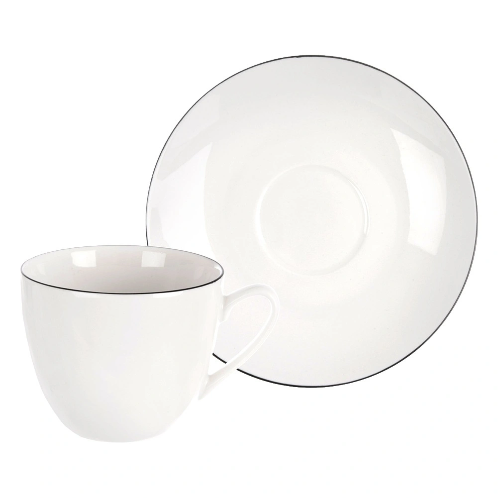 Wit porselein met een dunne donkere rand past in zowel moderne als klassieke interieurs en accentueert het serveren van koffie en thee.