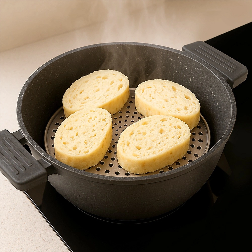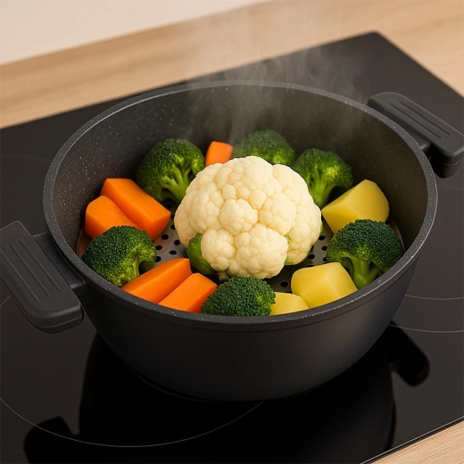 De doordachte constructie met pootjes houdt de inzet boven het waterniveau, zodat de stoom vrij kan circuleren en het eten niet aanbrandt of doorweekt. De inklappbare greep maakt veilig plaatsen en uitnemen ook tijdens het koken eenvoudig. Ideaal voor groenten, aardappelen, vis, zeevruchten, knoedels en voor zacht opwarmen zonder magnetron.
