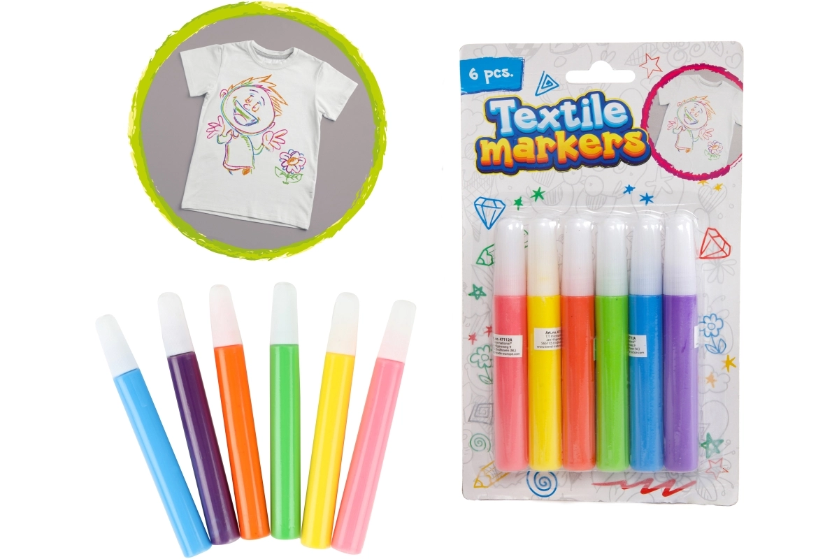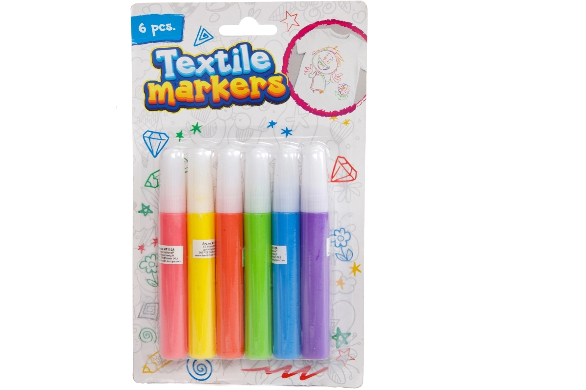 Kleur, omlijn en versier textiel met het gevarieerde palet van 6 tinten – ideaal voor T-shirts, tassen en kinderprojecten.