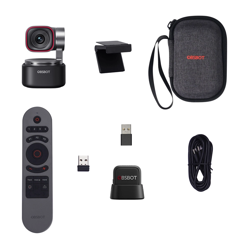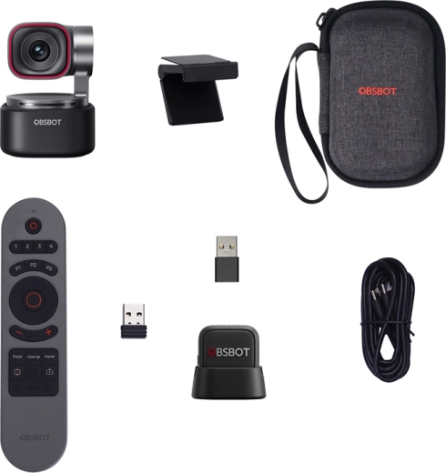 - OBSBOT Tiny 3 webcam; OBSBOT Tiny Smart Remote 2; OBSBOT Vox SE microfoon; Verstelbare houder; USB‑C–USB‑C‑kabel; USB‑C–USB‑A‑adapter; Etui