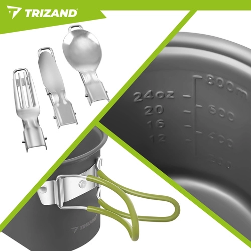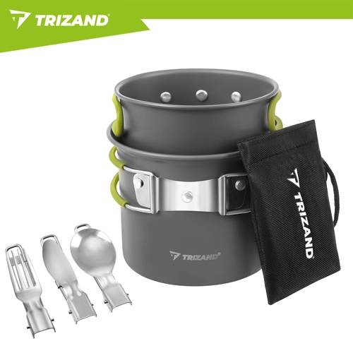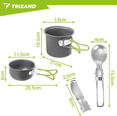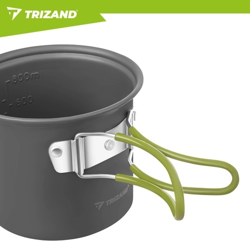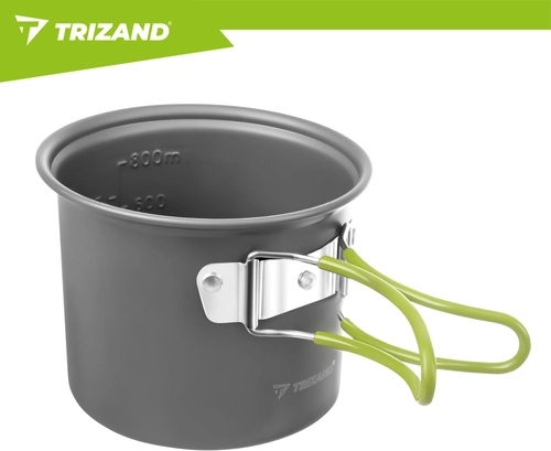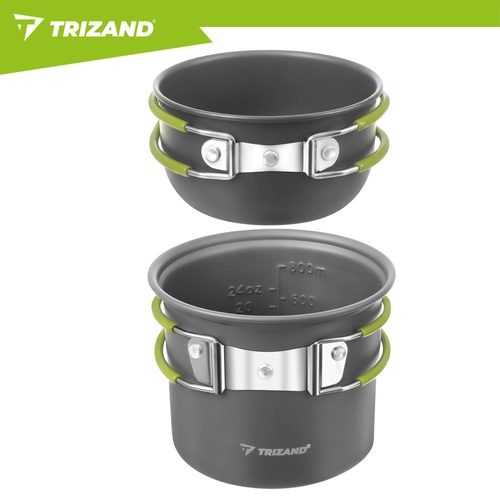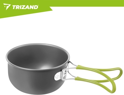 De praktische TRIZAND kookset is gemaakt van een slijtvaste aluminiumlegering (dikte 0,8 mm) voor efficiënt koken in de buitenlucht. Compacte afmetingen van pan en kom/koekenpannetje met deksel besparen ruimte in de rugzak, terwijl opvouwbare ergonomische handgrepen met vergrendeling een veilige grip bieden zonder risico op verbranding.