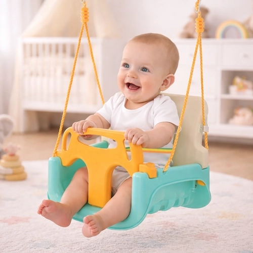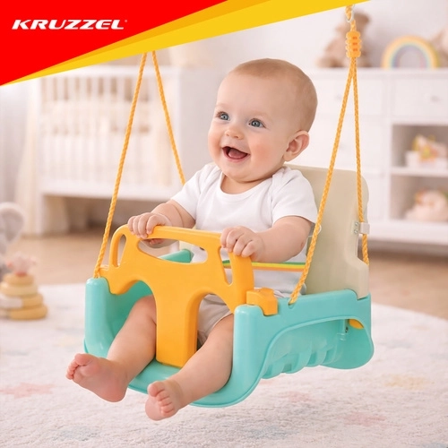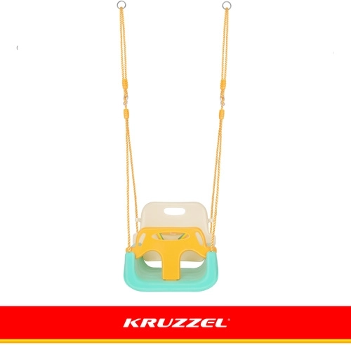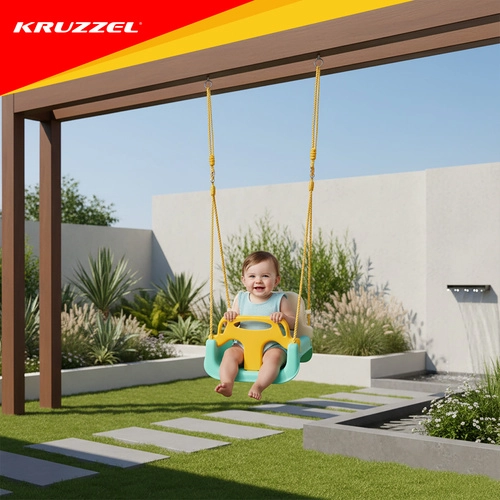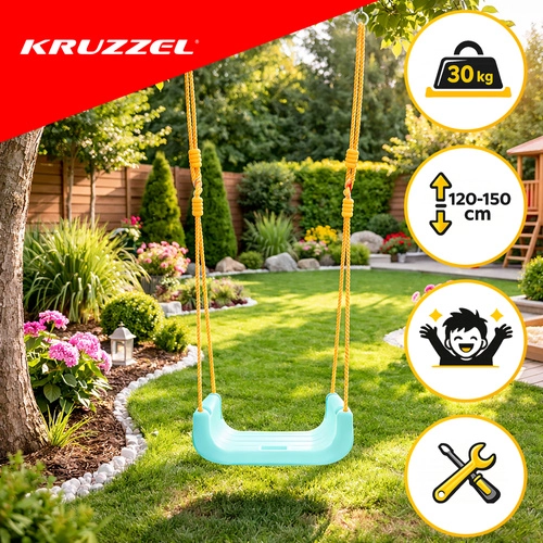 Universele 3-in-1 kinder schommel KR UZZEL past zich aan de groei van je kind aan – van baby tot kleuter. Biedt een afneembare voorbeugel en rugleuning, een veiligheidsriem, verstelbare touwen (120–150 cm) en een draagvermogen van 30 kg. De duurzame kunststof constructie is geschikt voor binnen en buiten en zorgt elke dag voor veilig en comfortabel schommelen.