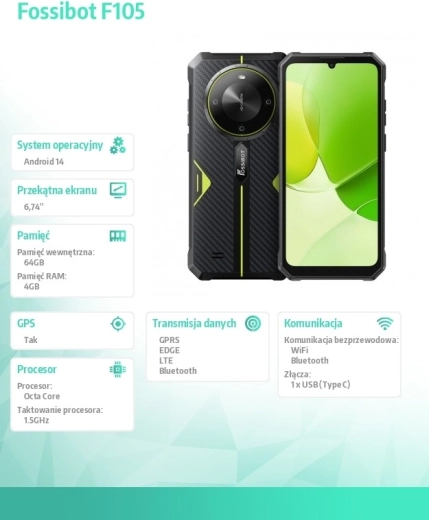 Ontdek de robuuste smartphone Fossibot F105 met groene accenten, die een stevige constructie, een multilenscamera en een groot scherm met druppelinkeping combineert. Dankzij de versterkte hoeken, de zekere grip en de duurzame behuizing is hij ideaal voor veeleisende omstandigheden, terwijl hij soepele prestaties in apps en kwalitatieve opnamen biedt.