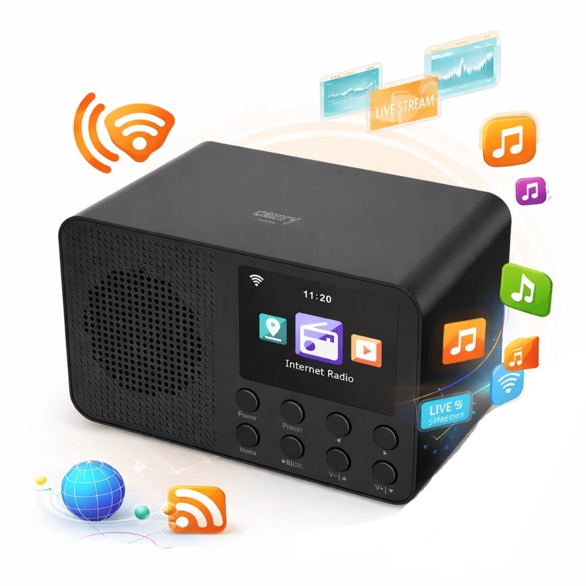 De CAMRY-internetradio combineert klassieke bediening met de online wereld. Dankzij Wi‑Fi ontdek je gemakkelijk duizenden zenders, podcasts en genres van over de hele wereld, terwijl Bluetooth je laat streamen vanaf je telefoon of tablet. Het 2,4" TFT-kleurendisplay toont zendernaam, tijd en datum duidelijk onder alle omstandigheden.