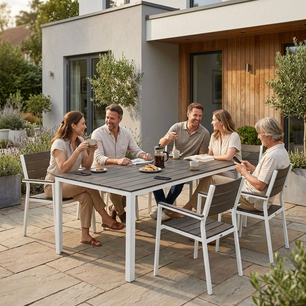 Geniet zorgeloos en in stijl van gezamenlijke momenten buiten. De MULTIGARDEN tuintafel combineert een minimalistisch design in elegant grijs‑wit met praktische materialen. Het robuuste frame van stalen profielen is sterk en vormvast, terwijl het polywood blad met tussenruimtes waterafvoer mogelijk maakt en natuurgetrouw de structuur van hout imiteert.