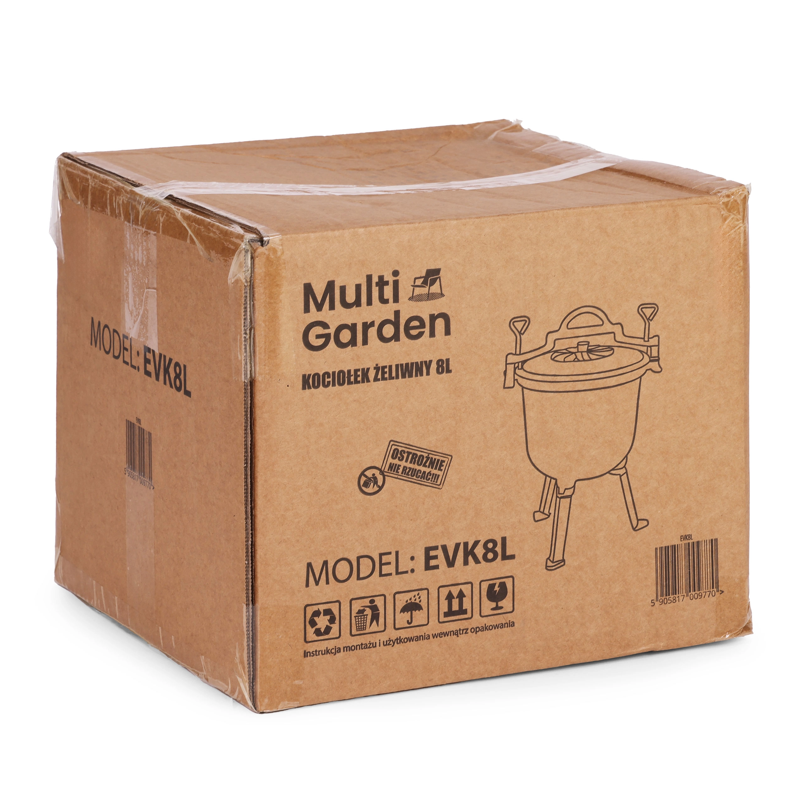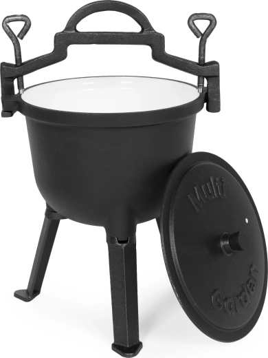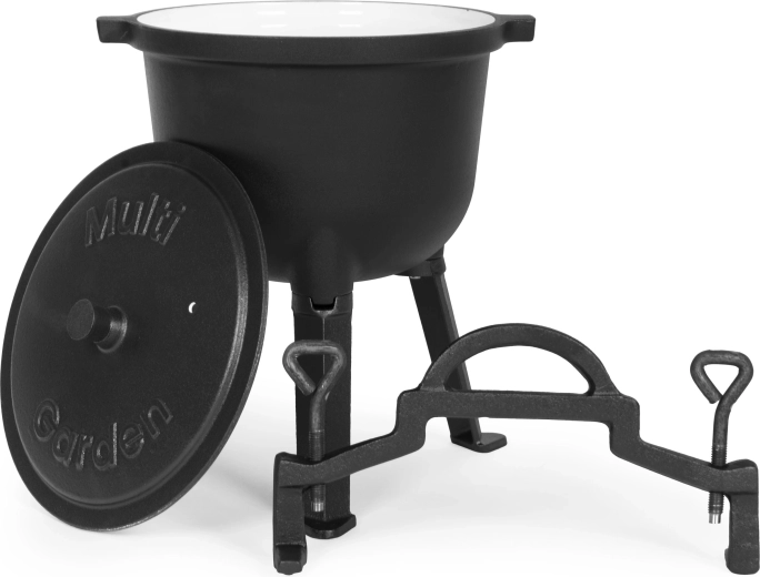 Robuuste gietijzeren ketel met een inhoud van 8 l en MULTIGARDEN-standaard, ideaal om te koken in de tuin, bij het kampvuur of op de camping. Dankzij het geëmailleerde interieur is hij makkelijk schoon te maken, geleidt gietijzer warmte uitstekend en zorgt het voor gelijkmatig stoven, koken en bakken. De ketel heeft afneembare pootjes voor gemakkelijk transport, een veilig draaghandvat en een deksel met ventilatieopening voor betere kookcontrole.