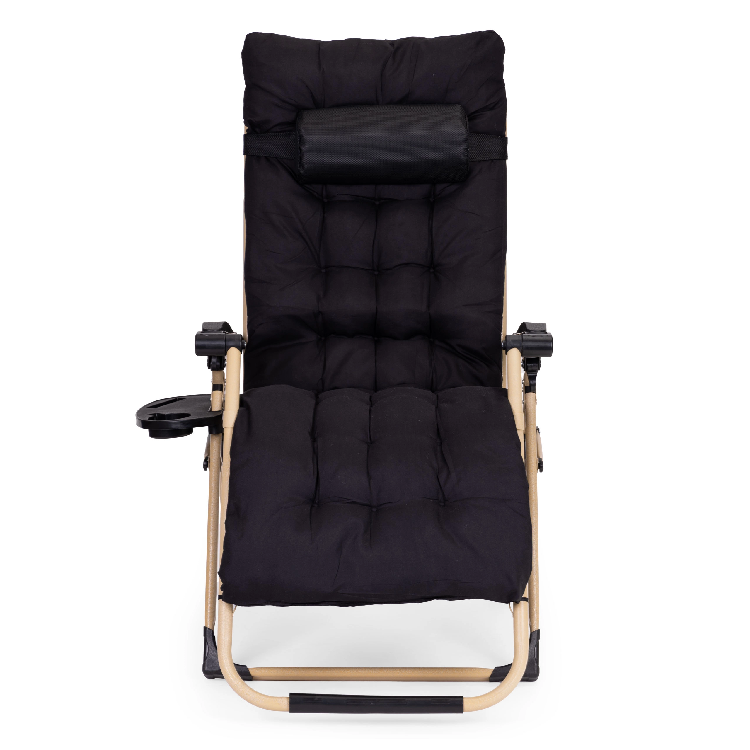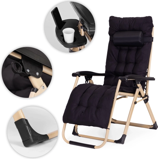 Dankzij de traploze verstelling en het vergrendelmechanisme stel je eenvoudig de ideale lighoek in. De Zero-Gravity positie verlicht de rug en ondersteunt natuurlijke ontspanning. Het zij-aflegtafeltje met bekerhouder en ruimte voor je telefoon houdt alles wat je nodig hebt binnen handbereik.
