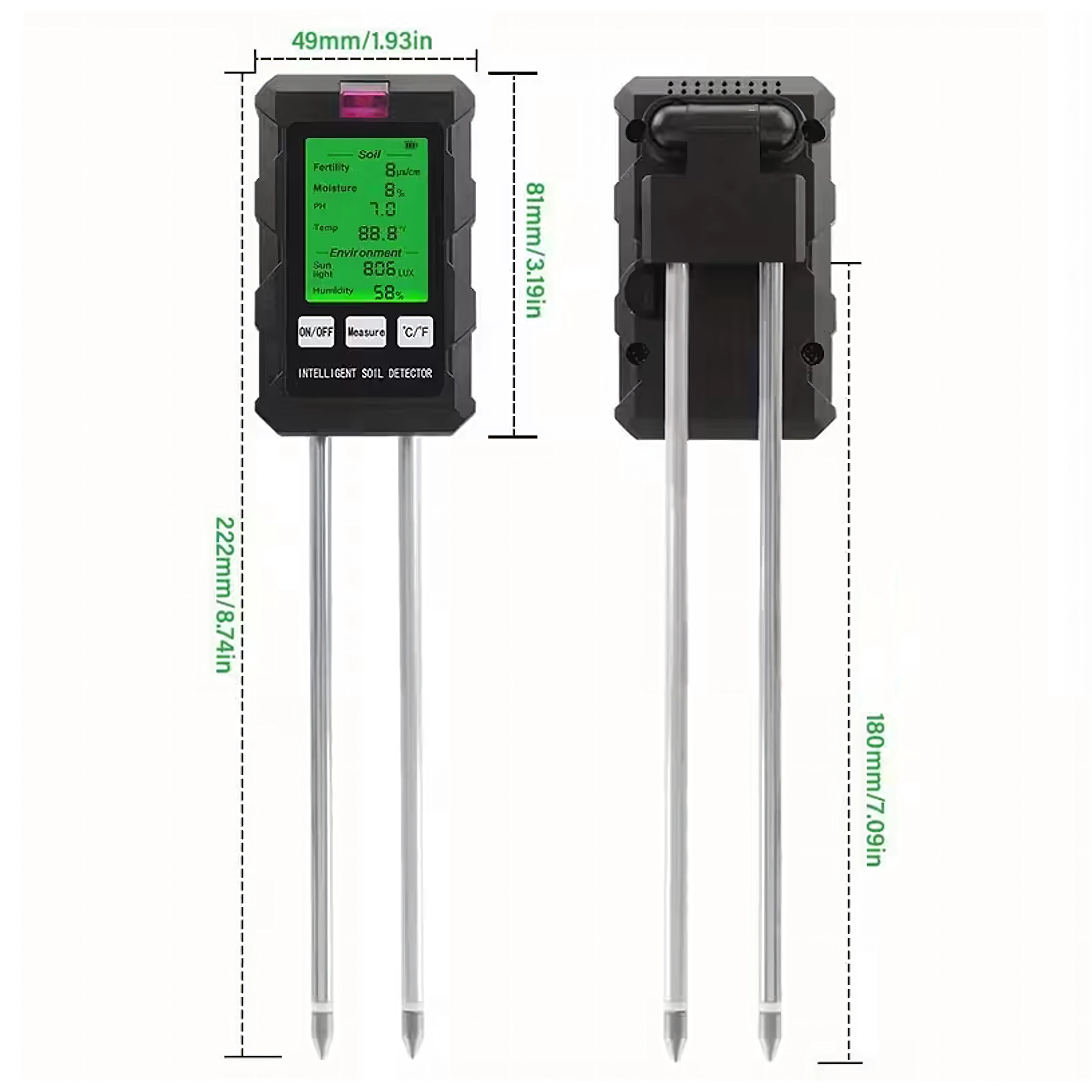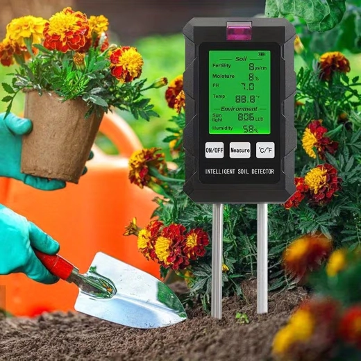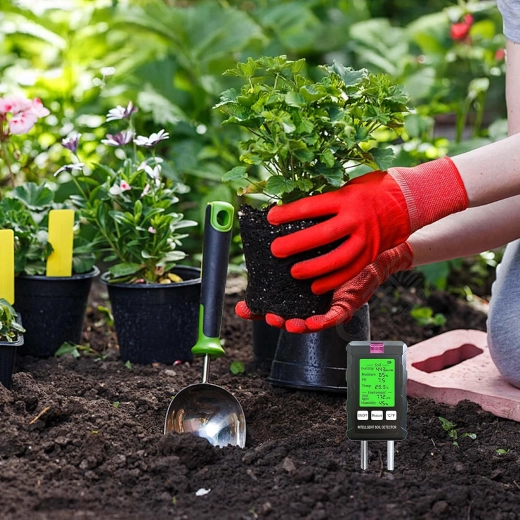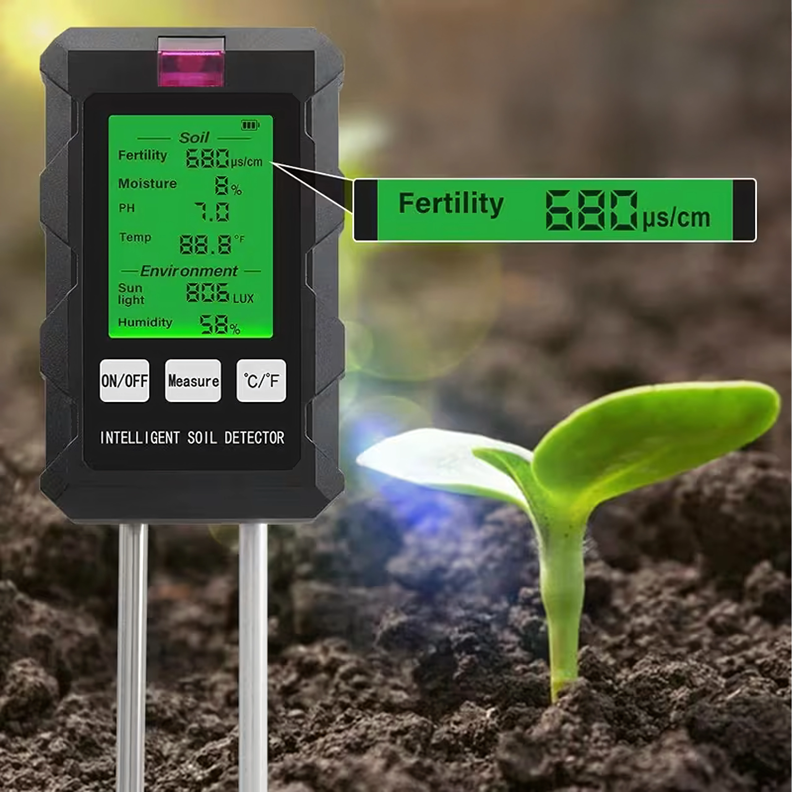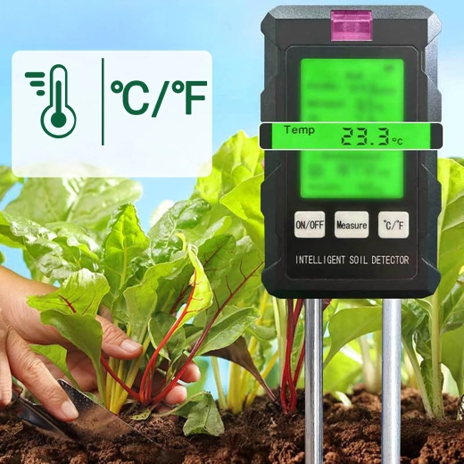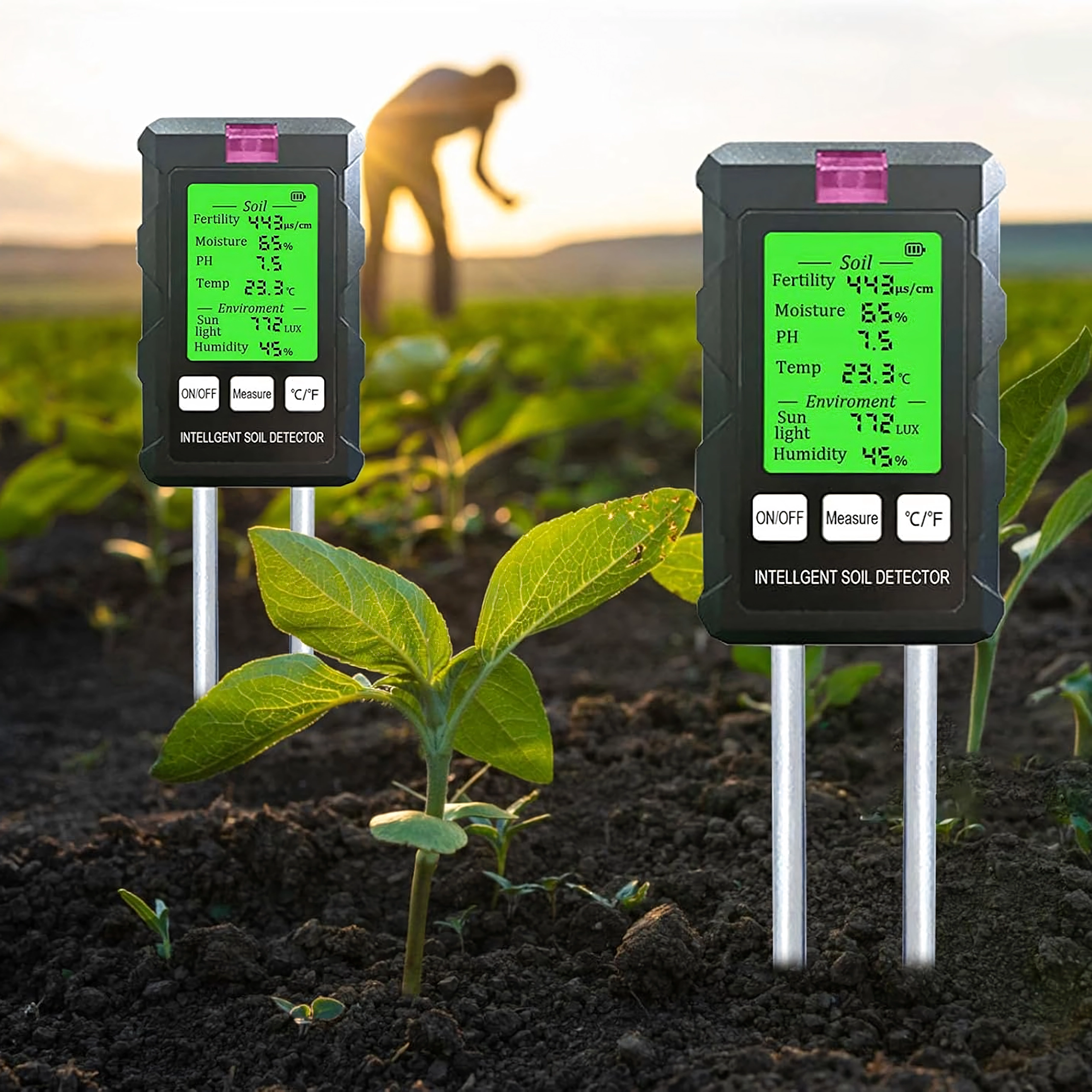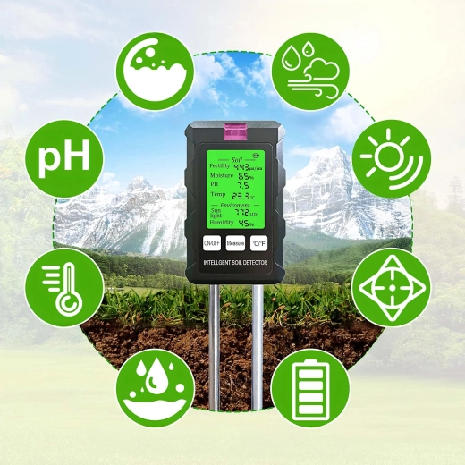 Meet pH, vocht en temperatuur van de bodem, vruchtbaarheid (nutriënten), lichtintensiteit en luchtvochtigheid – alles op één achtergrondverlicht display voor snelle beslissingen bij de verzorging van planten.