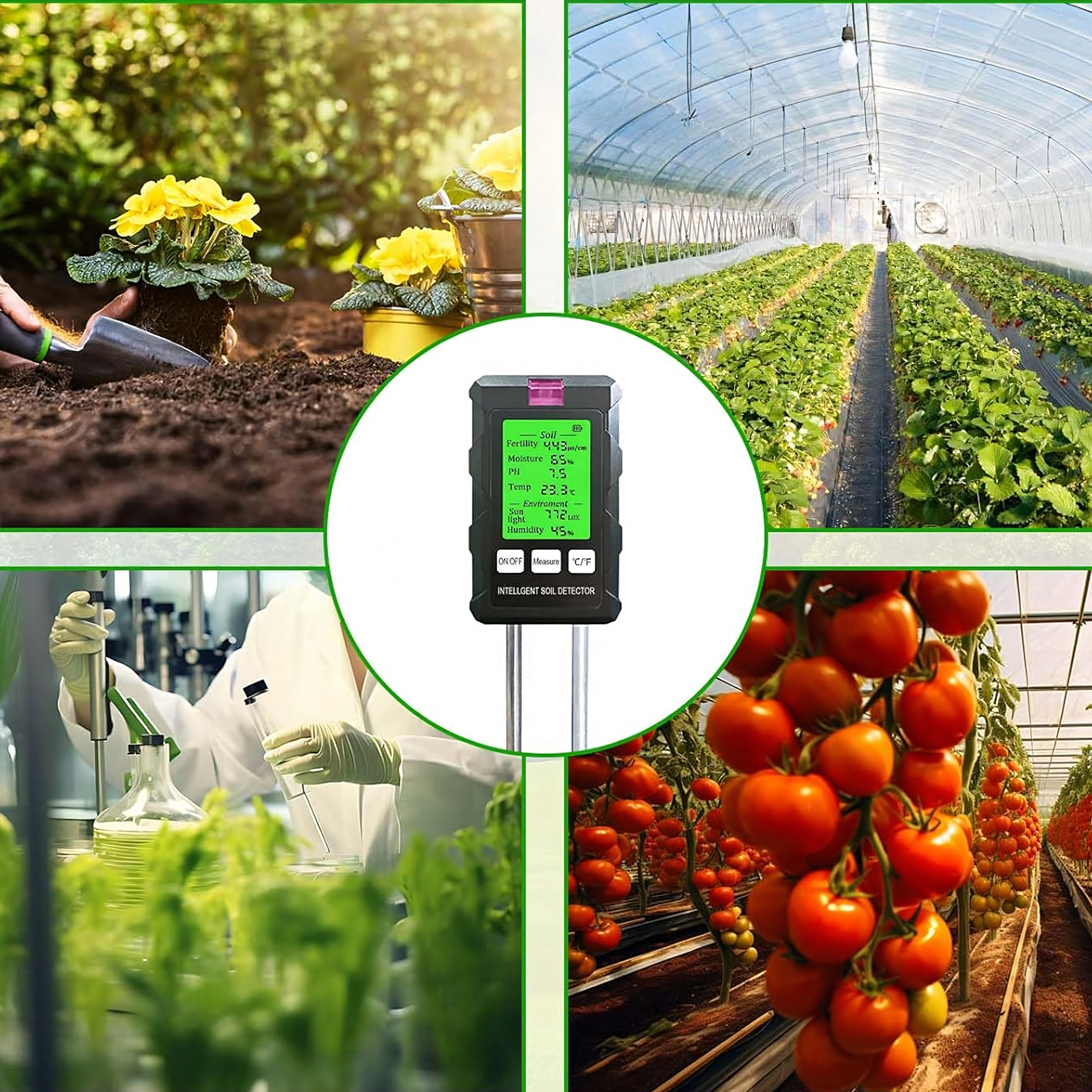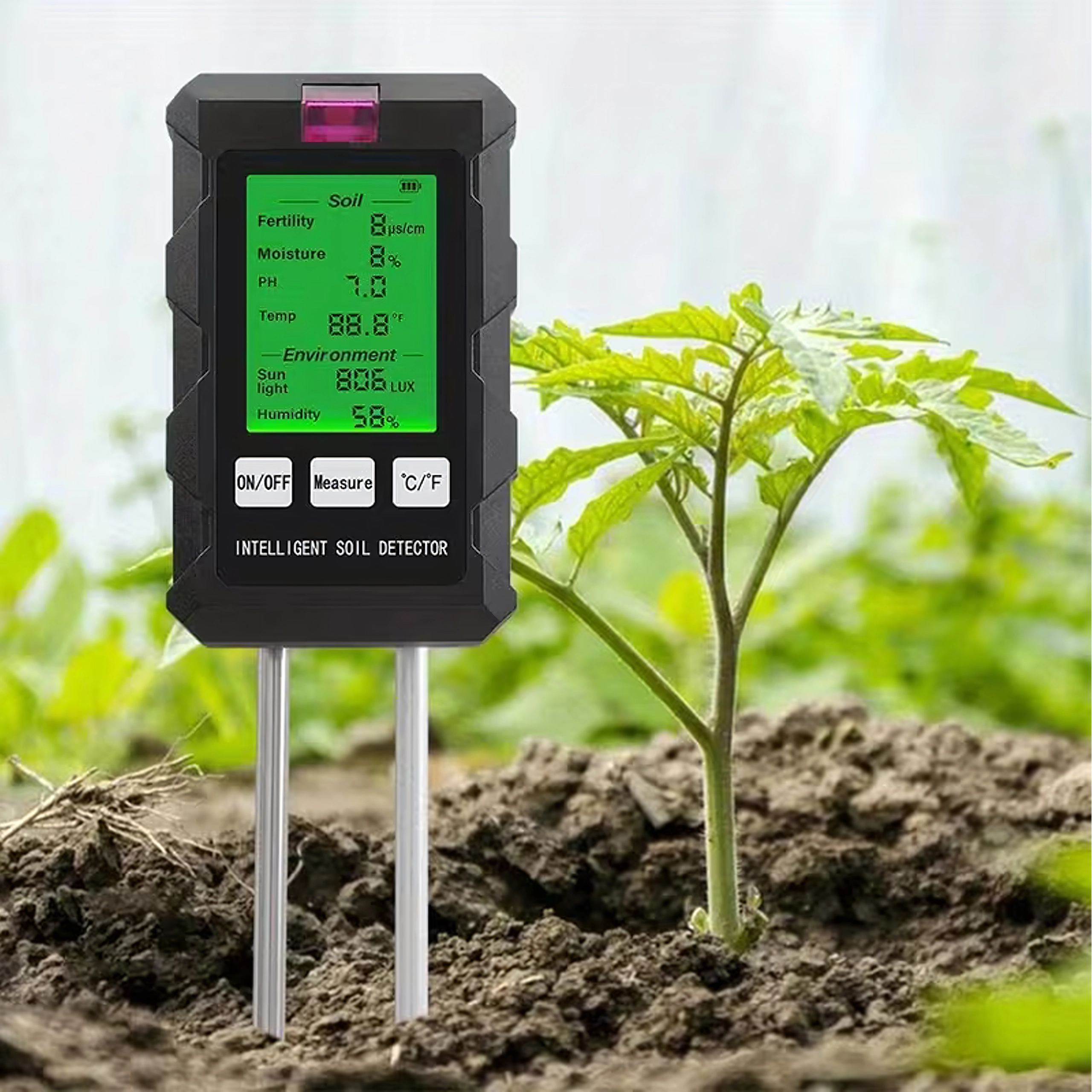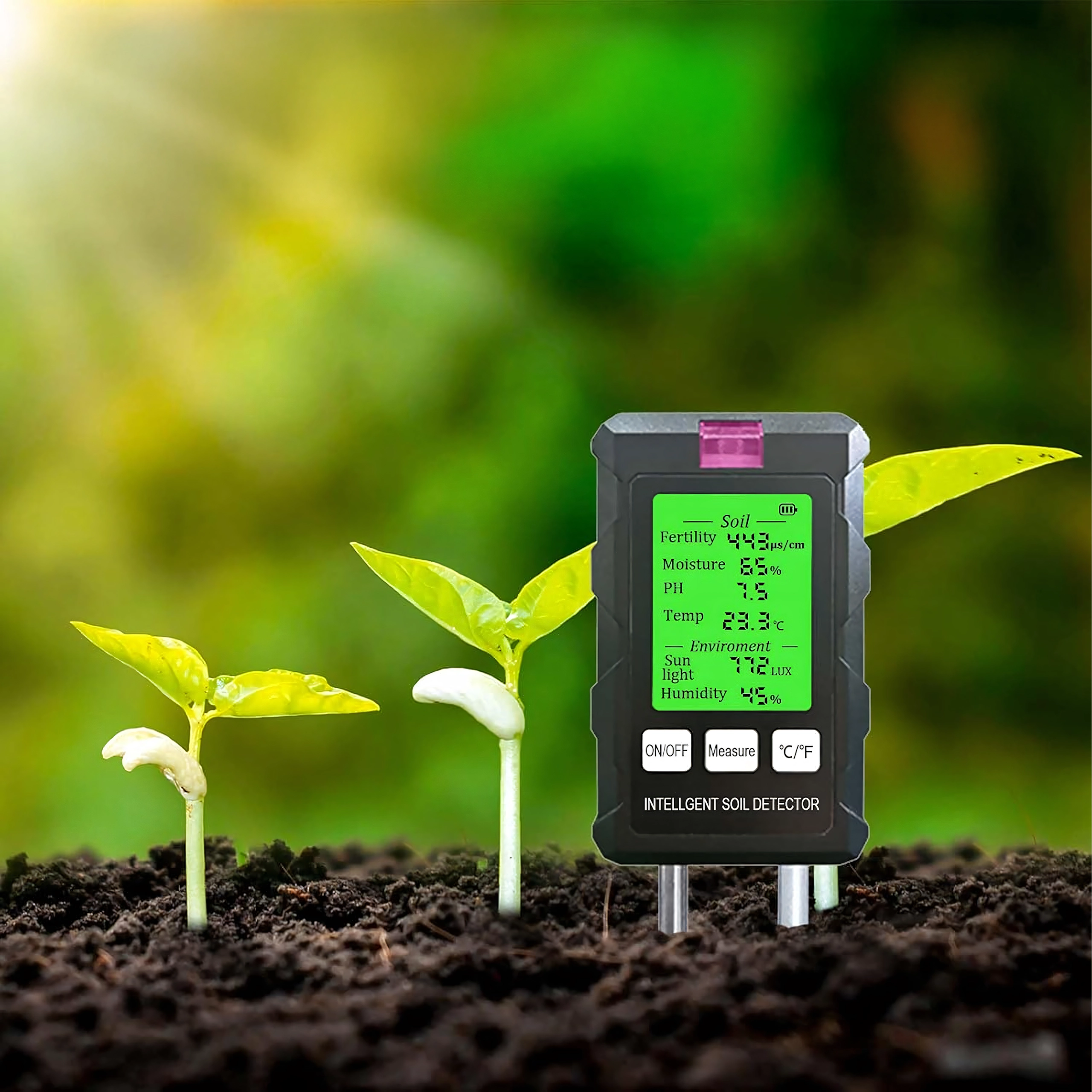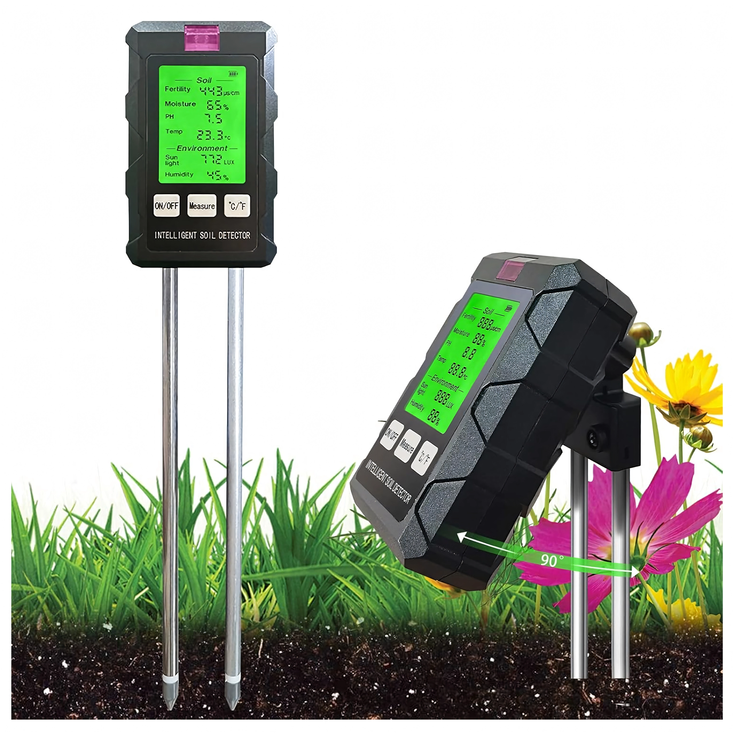 Het apparaat combineert zes metingen in één compact instrument: het monitort de pH van de bodem, vocht, temperatuur, vruchtbaarheid (nutriënten), lichtintensiteit en de luchtvochtigheid van de omgeving. Zo voorkom je te veel water geven, voedingstekorten en een ongeschikte standplaats, en bevorder je een gezonde groei en rijke bloei.