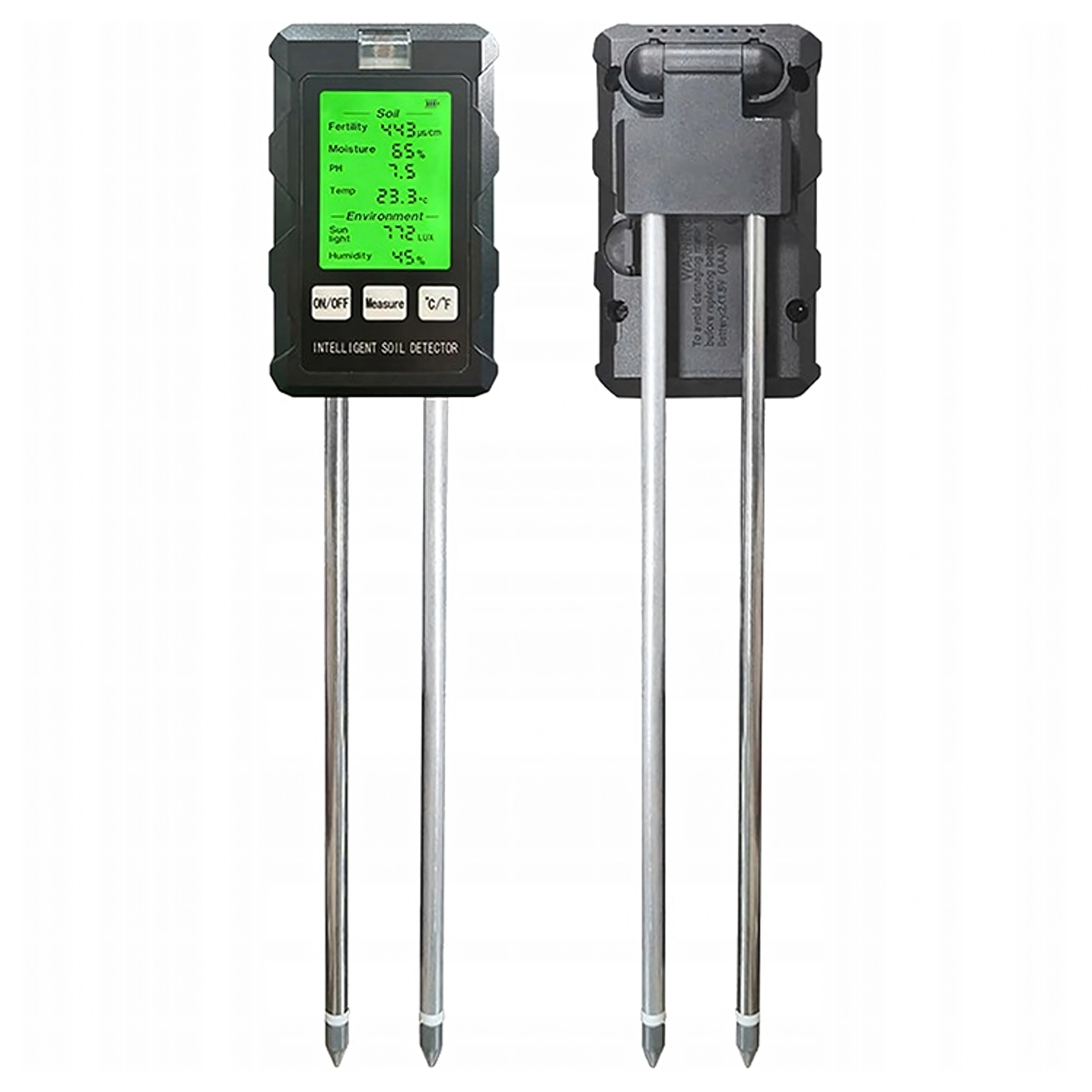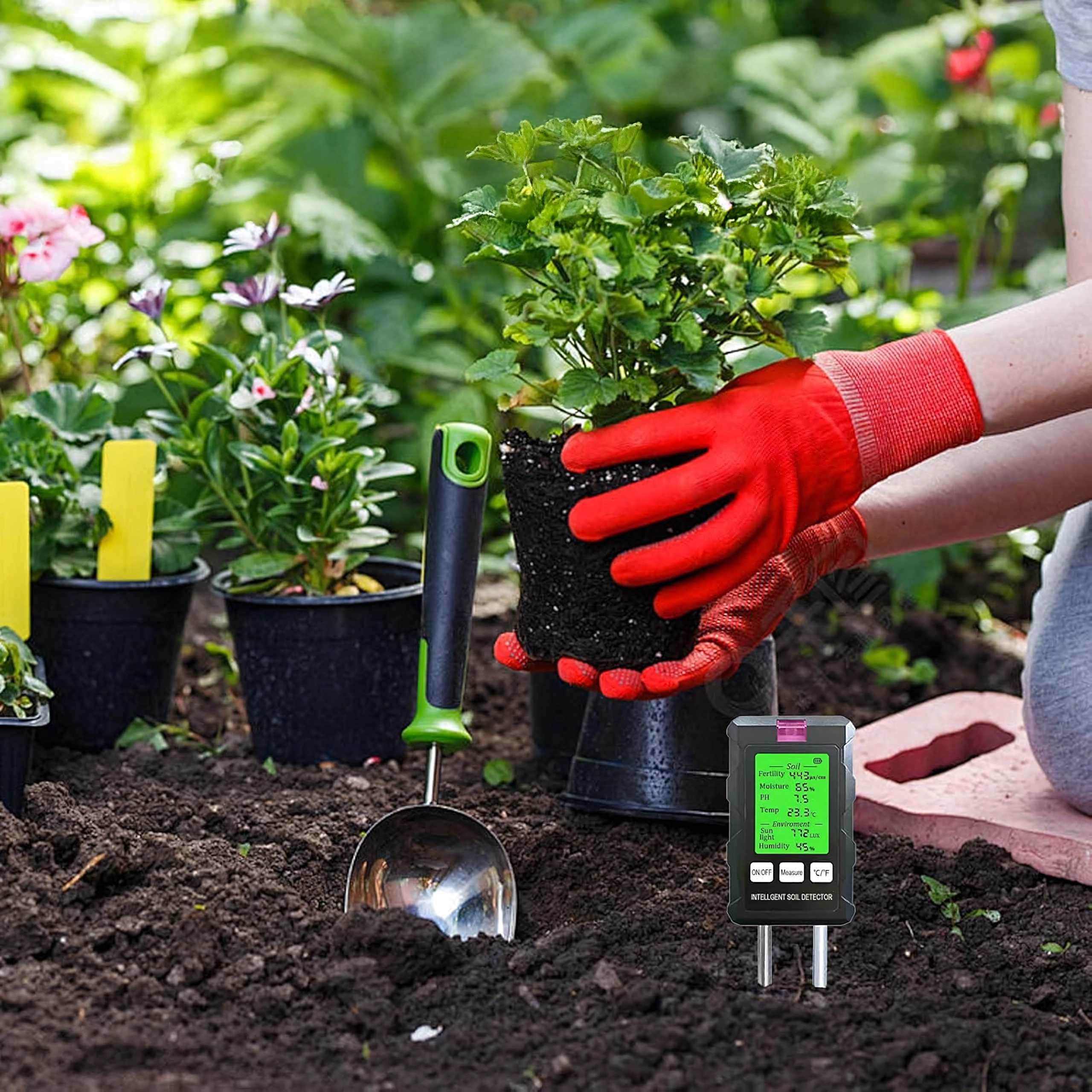 Slimme digitale 6-in-1 bodemmeter voor eenvoudige plantenverzorging. Toont direct pH, bodemvocht, temperatuur, vruchtbaarheid (nutriënten), lichtintensiteit en luchtvochtigheid op een overzichtelijk achtergrondverlicht LCD. De dubbele metalen sondes zorgen voor snelle en nauwkeurige metingen, zowel in de border als in de bloempot.