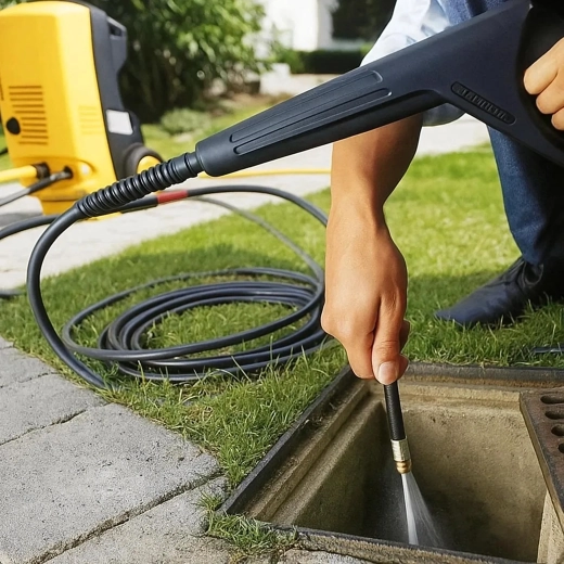 De nozzle richt de waterstraal die vervuiling in binnen- en buitenafvoeren losmaakt en wegspoelt.