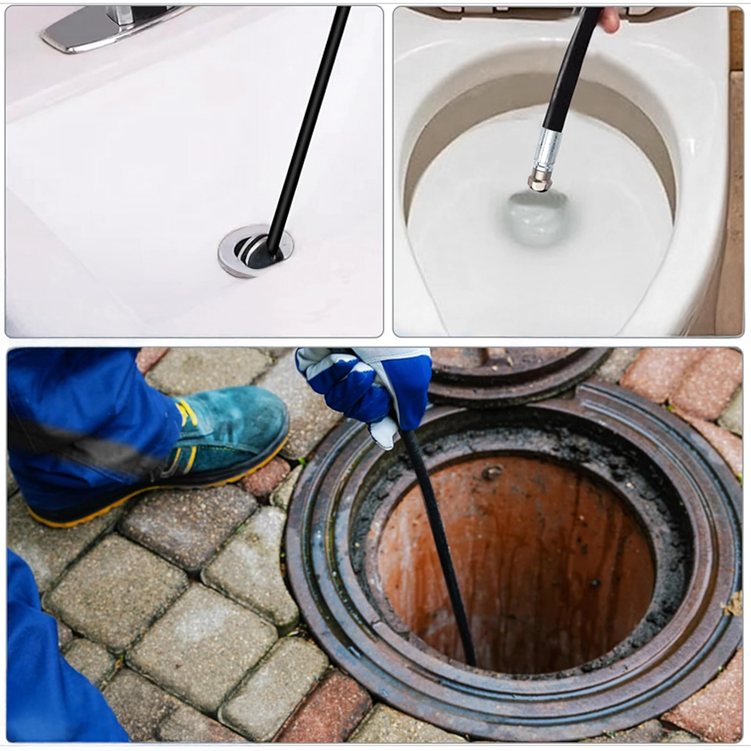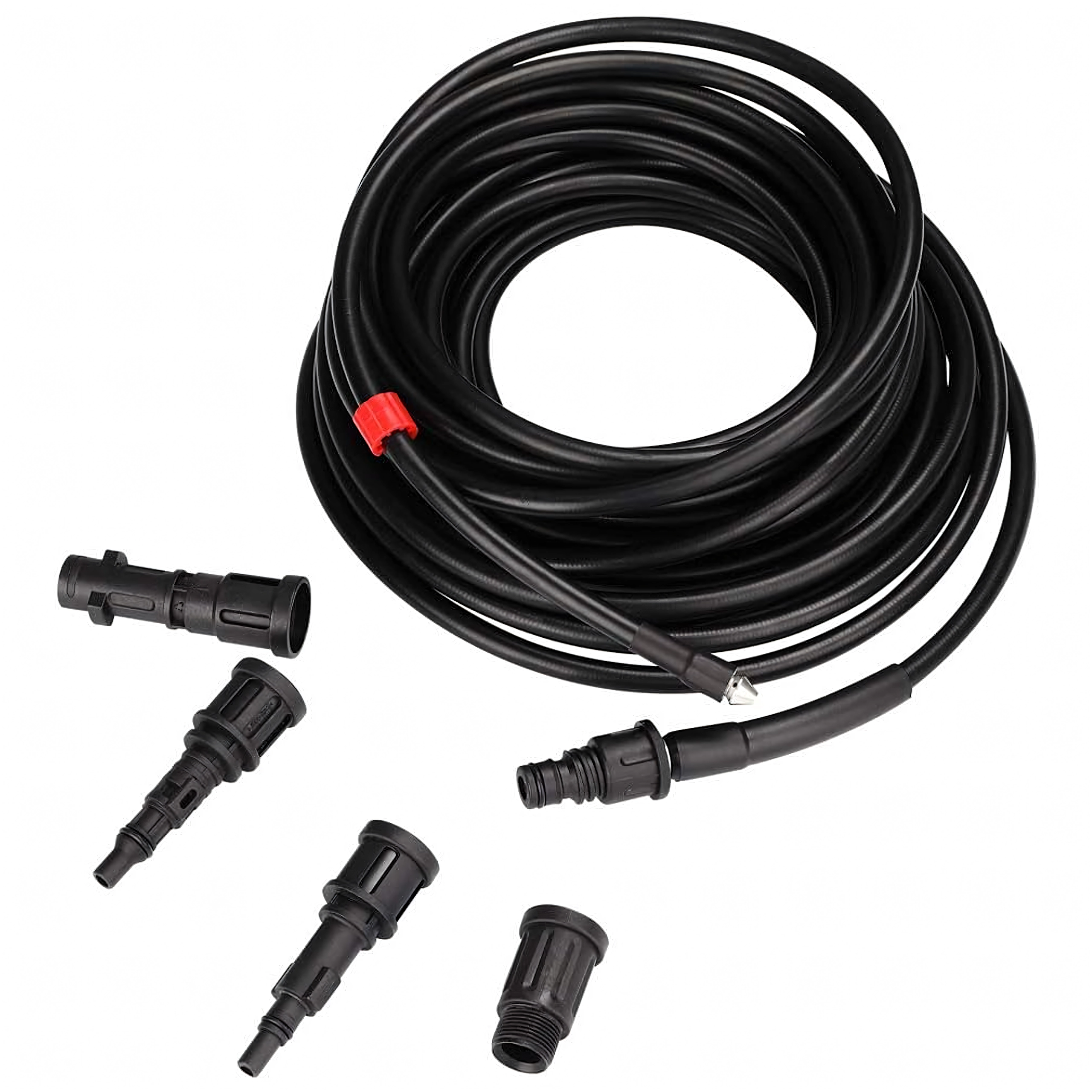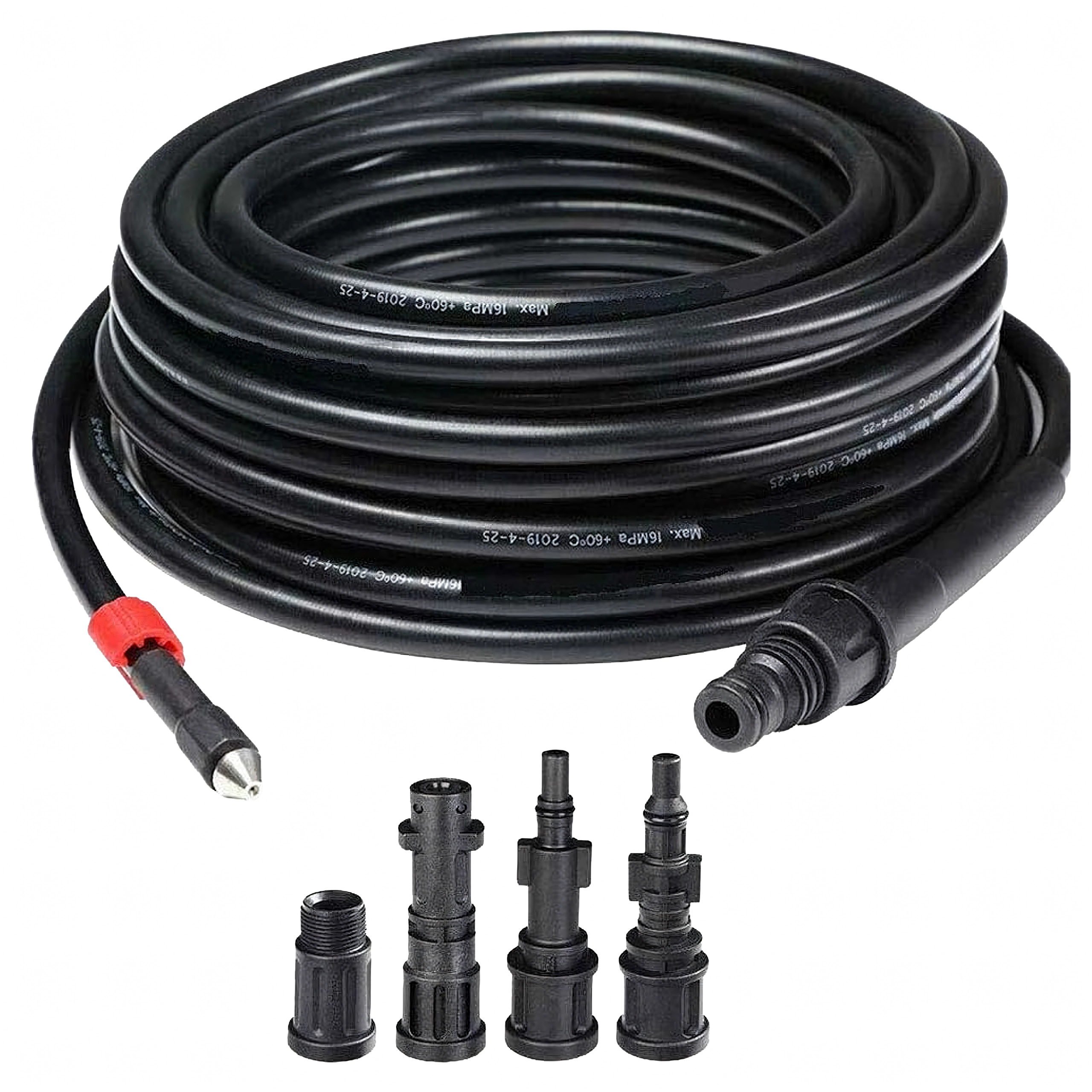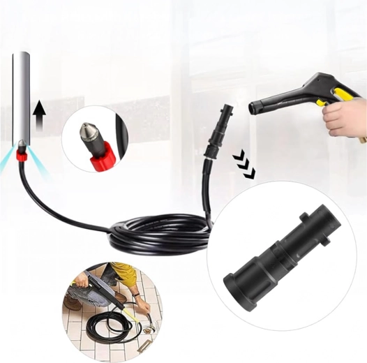 In de verpakking zitten verwisselbare adapters die de compatibiliteit met verschillende merken en typen hogedrukreinigers vergroten. De slang is ontworpen om moeiteloos door bochten en knieën van leidingen te gaan en met terugstraalnozzles vervuiling los te maken en weg te spoelen.