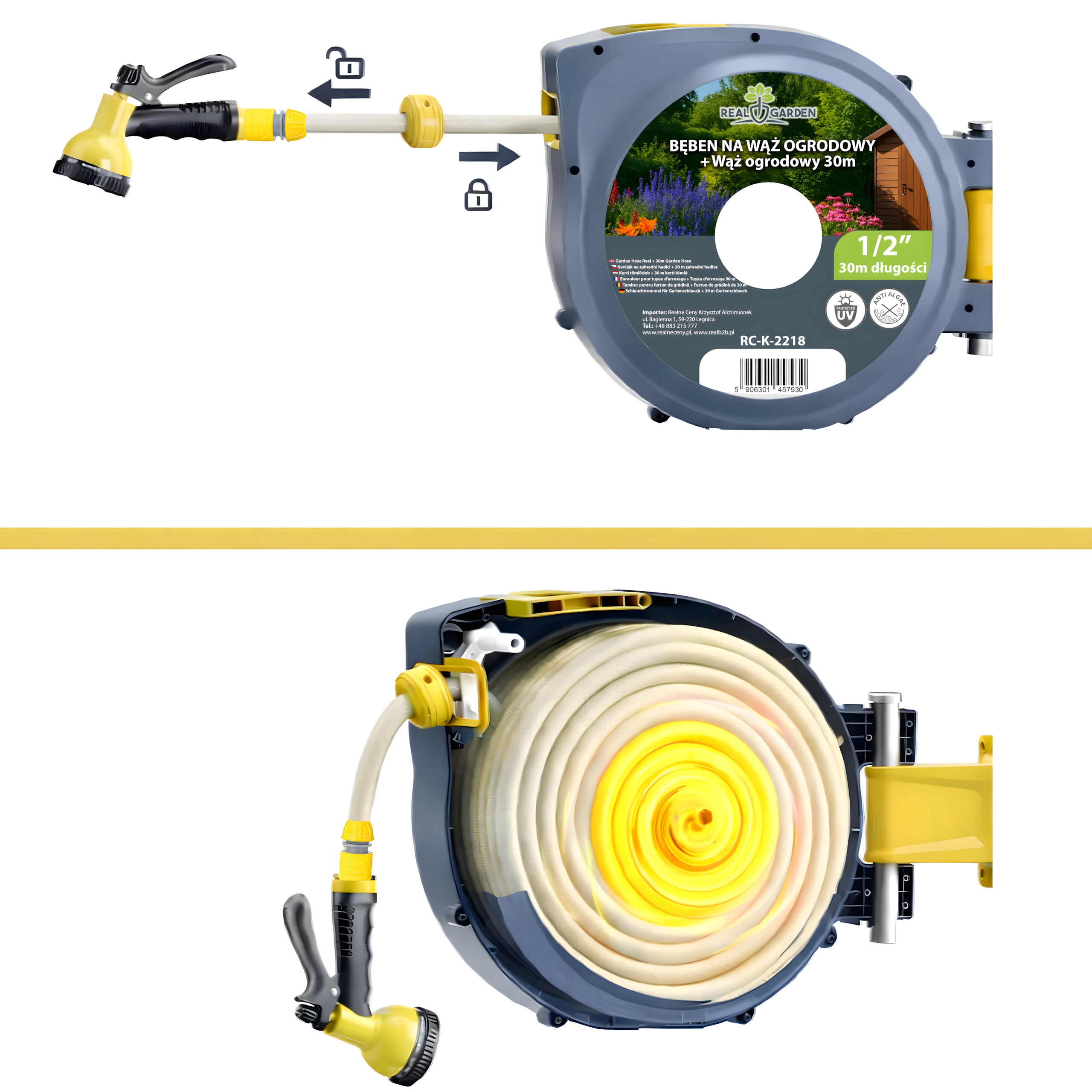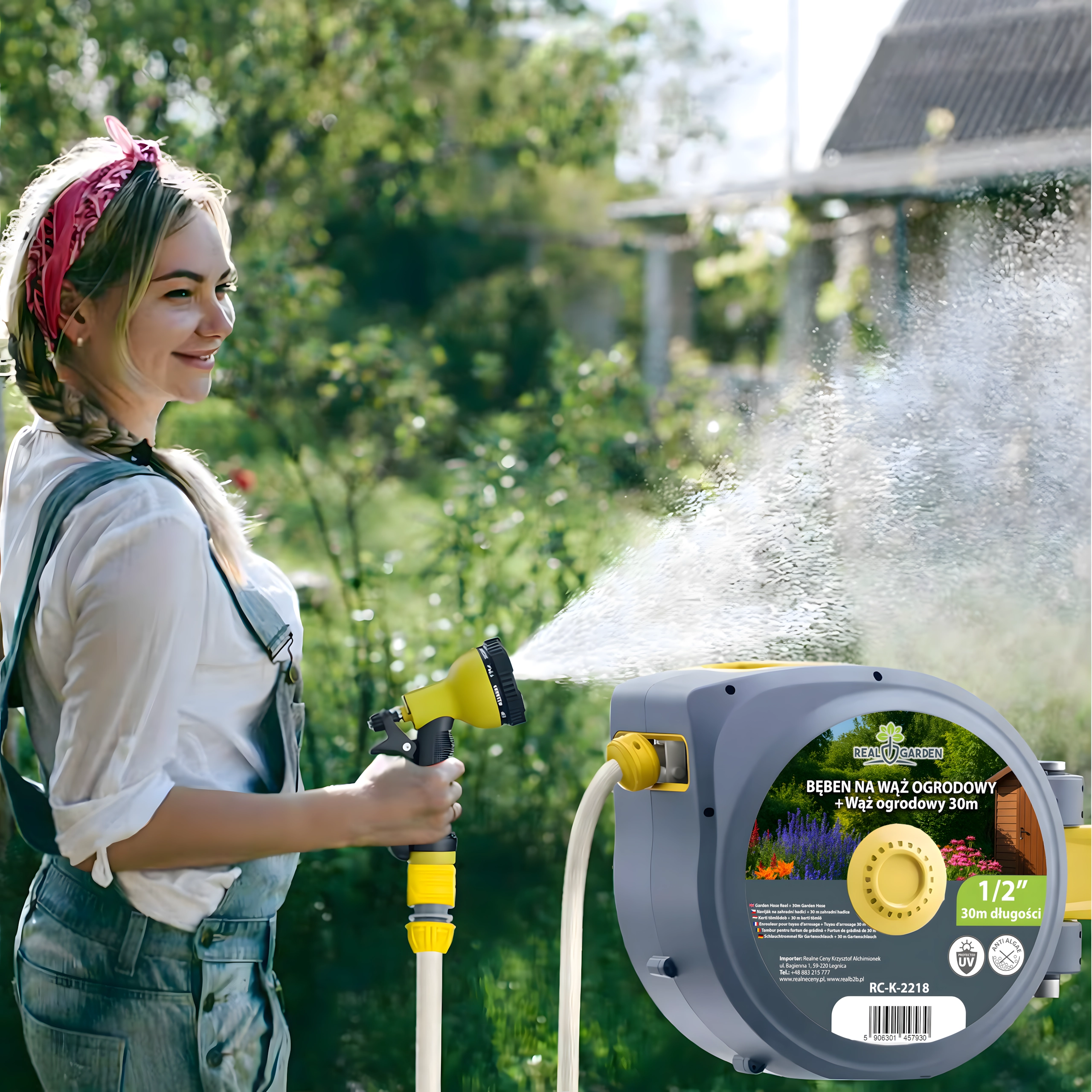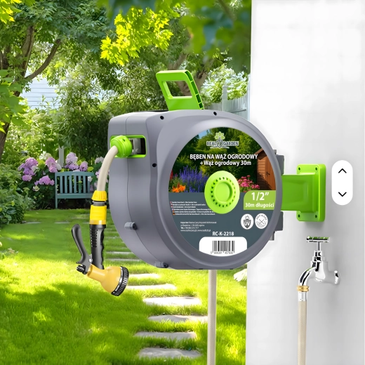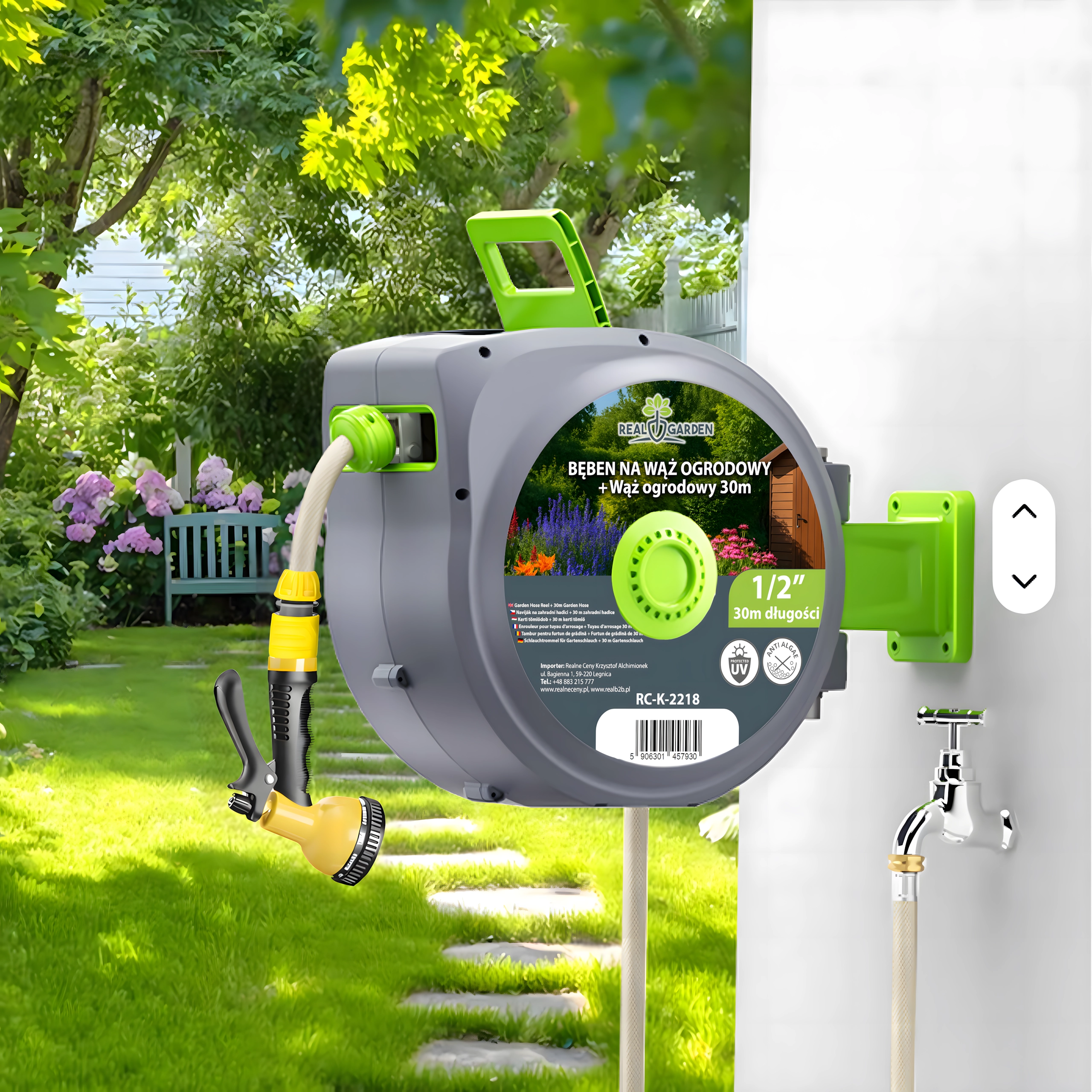 Houd je tuin perfect opgeruimd en maak het sproeien moeiteloos met de wandgemonteerde automatische slanghaspel met een 1/2" slang van 30 m. Het compacte en duurzame ontwerp met automatische oprolfunctie bespaart tijd en ruimte, de draaibare beugel vereenvoudigt de bediening en de multifunctionele sproeier zorgt voor de juiste waterstraal voor elke taak.