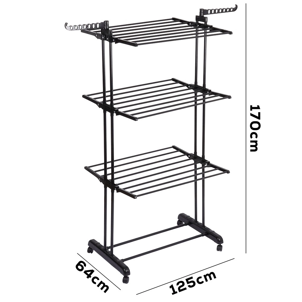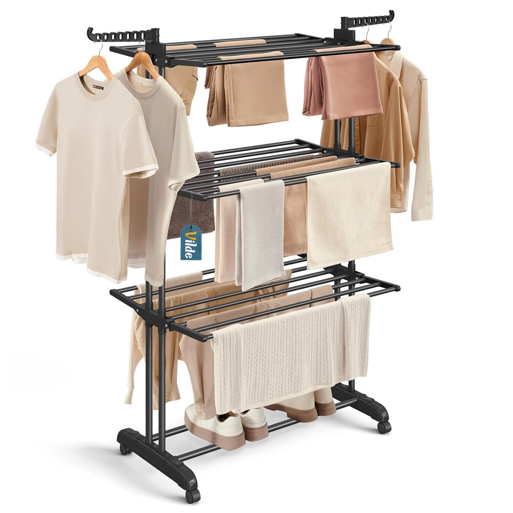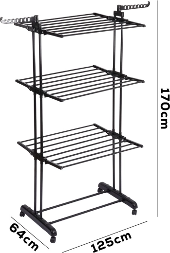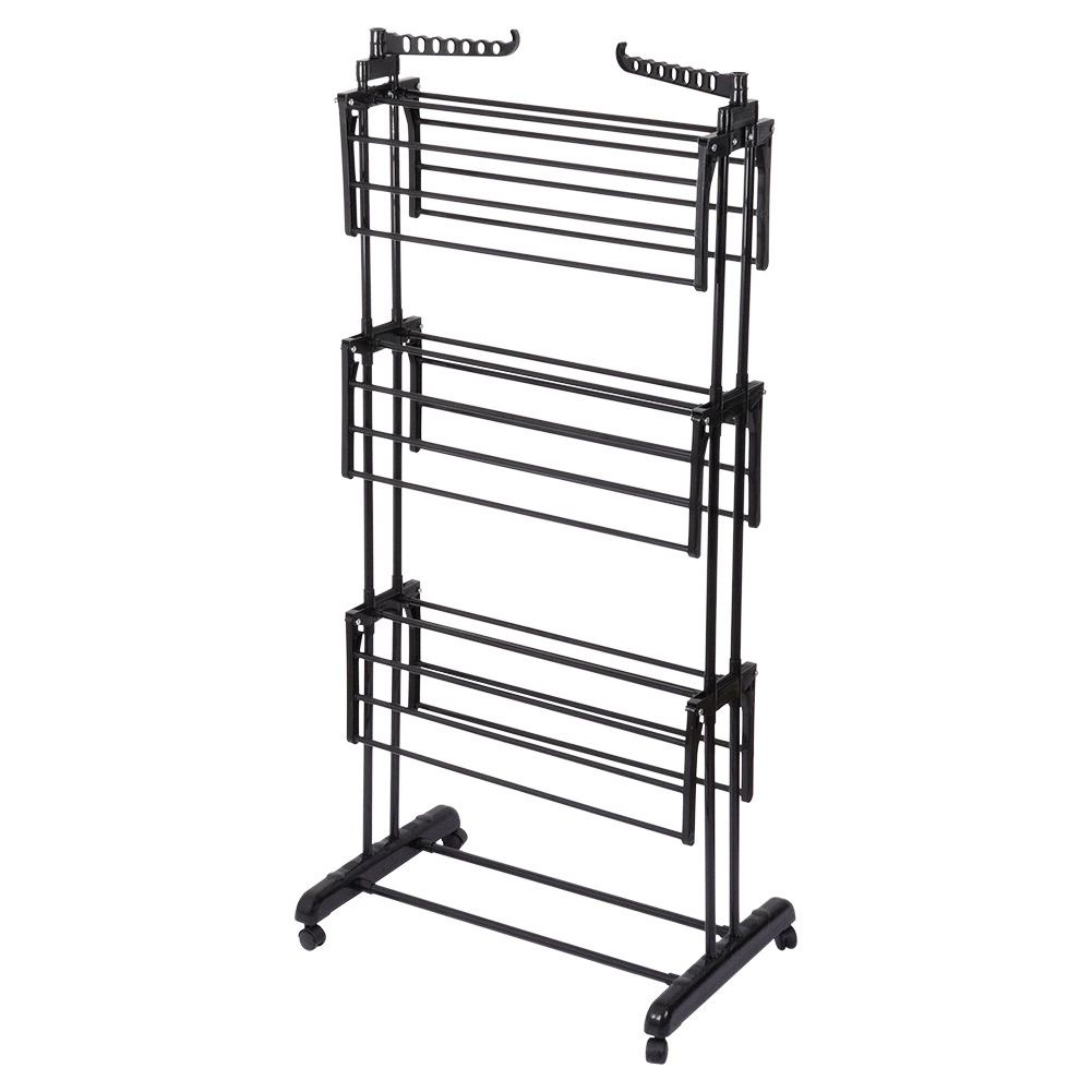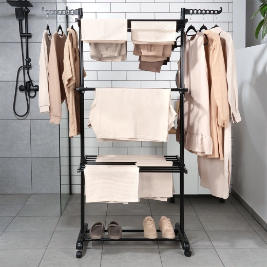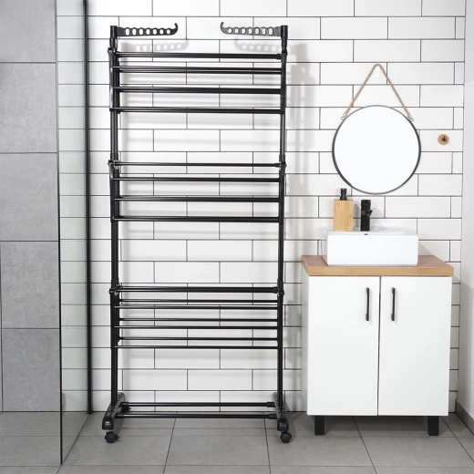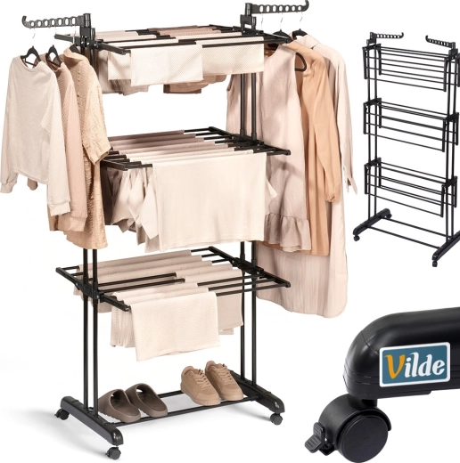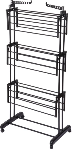 Praktisch driedelig wasdroogrek met een robuuste metalen constructie in het zwart, met tot 24 m droogoppervlak, draagvermogen 25 kg en handige wielen met rem. Dankzij het verticale ontwerp bespaart het ruimte, heeft het inklappbare vleugels, zijdelingse armen voor hangers (14 posities) en een onderste plank voor schoenen – ideaal voor in huis, op het balkon en op het terras.
