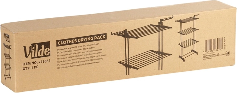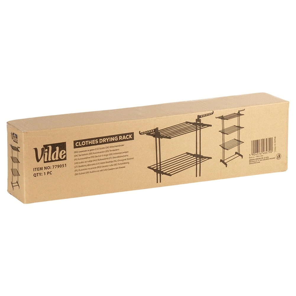 Maximaliseer de ruimte bij het drogen van was met het verticale droogrek VILDE. Drie niveaus, zes onafhankelijk neerklapbare vleugels en twee armen voor hangers maken het mogelijk het drogen aan te passen aan zowel kleine als grote wasladingen. De stabiele metalen constructie met poedercoating blinkt uit in vochtbestendigheid en duurzaamheid.