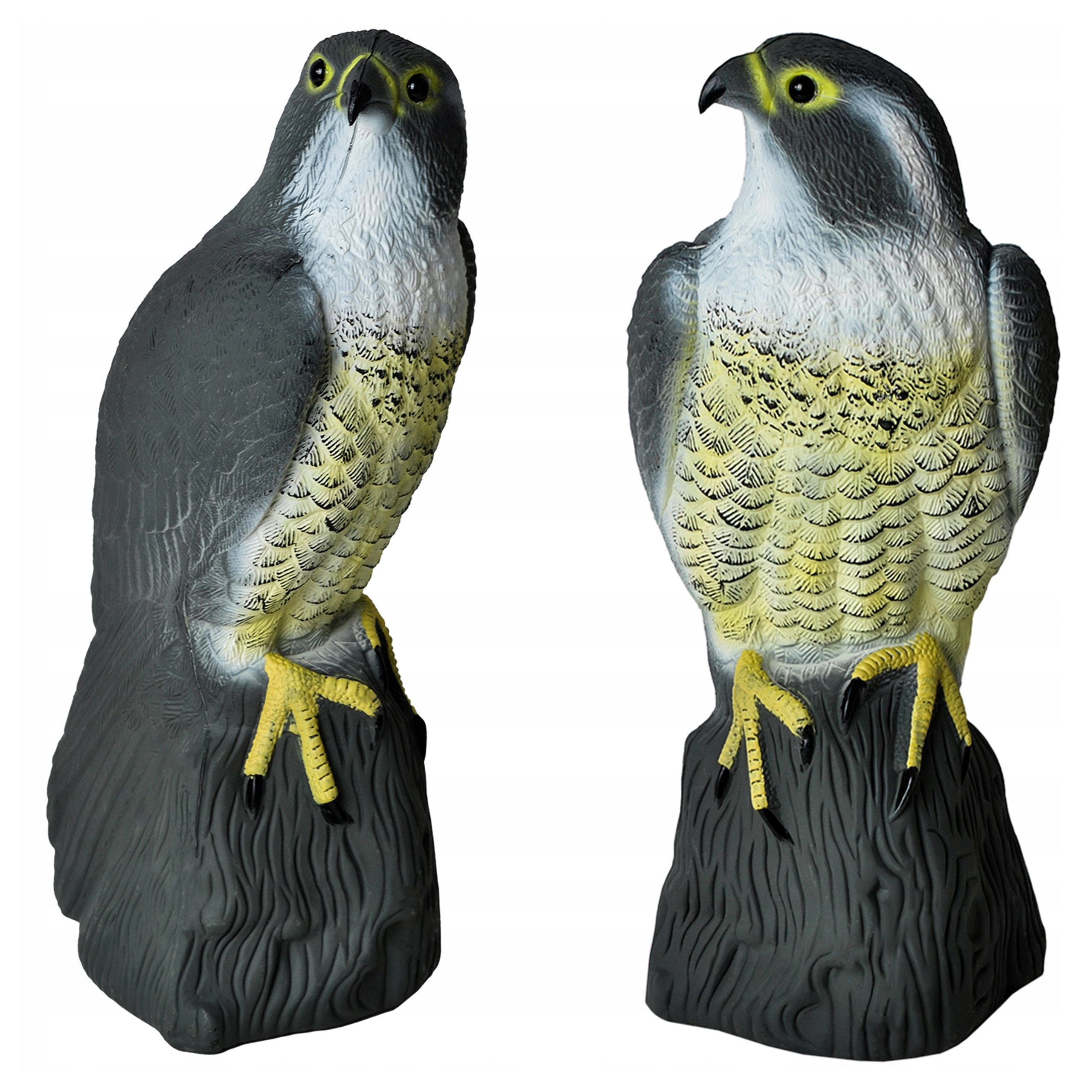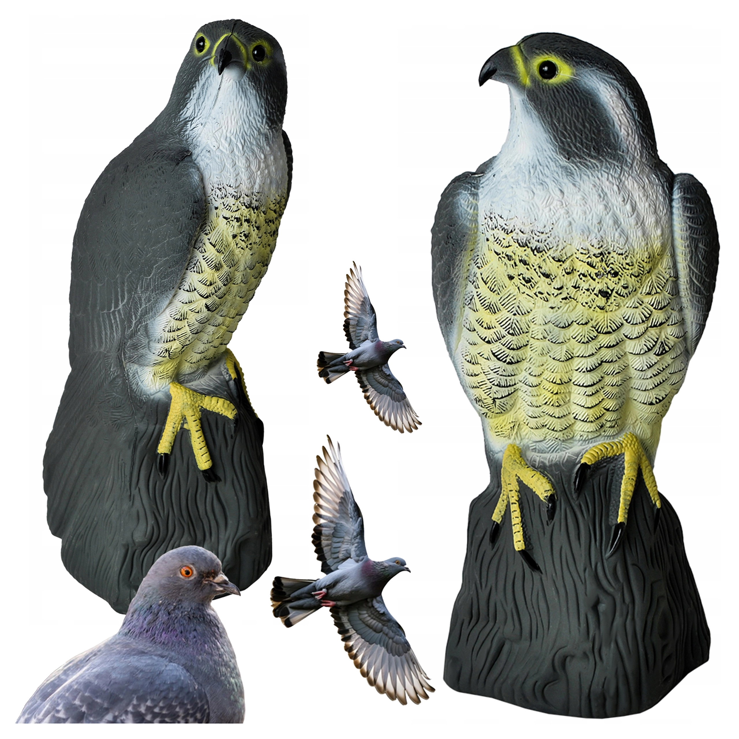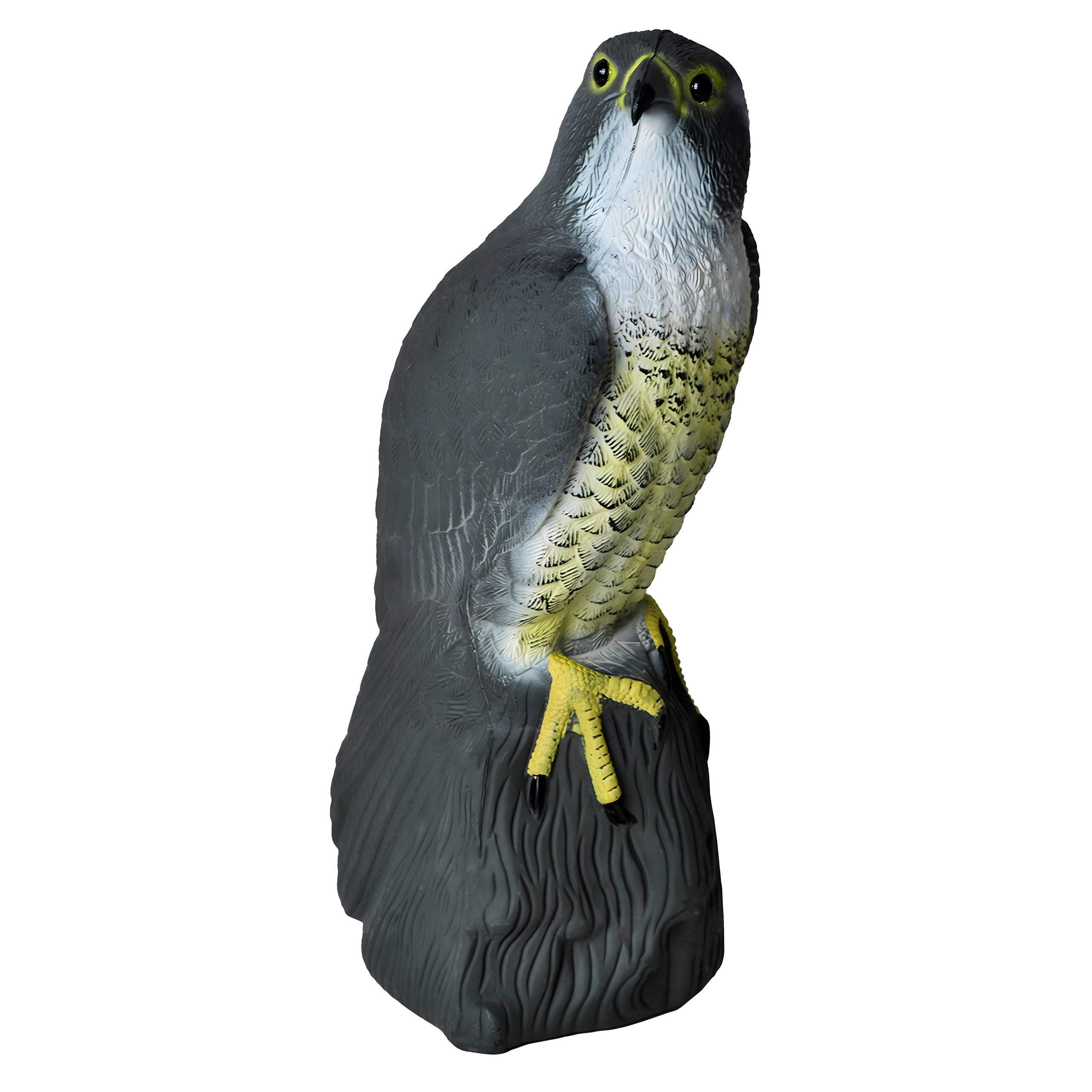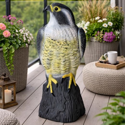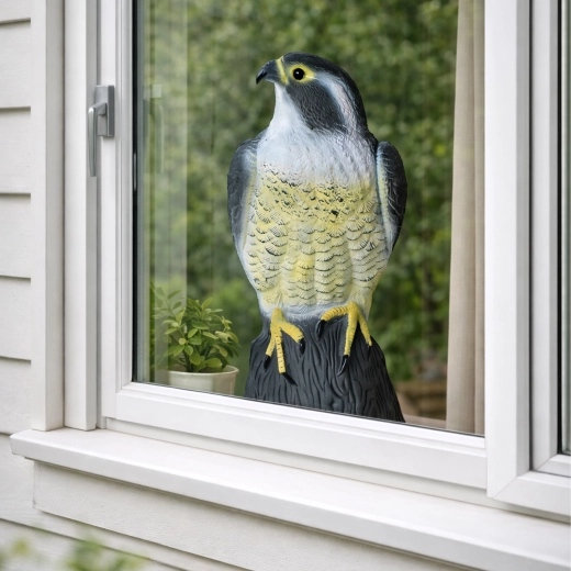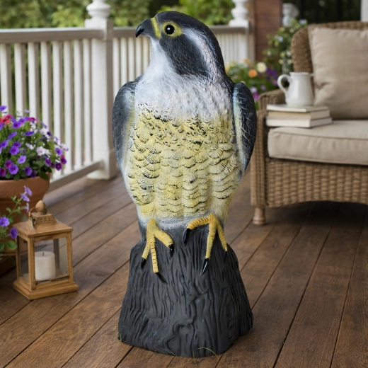 De natuurgetrouwe kleuring, verenstructuur en natuurlijke houding van de valk versterken het psychologische effect op kleinere vogels en voorkomen dat ze landen.